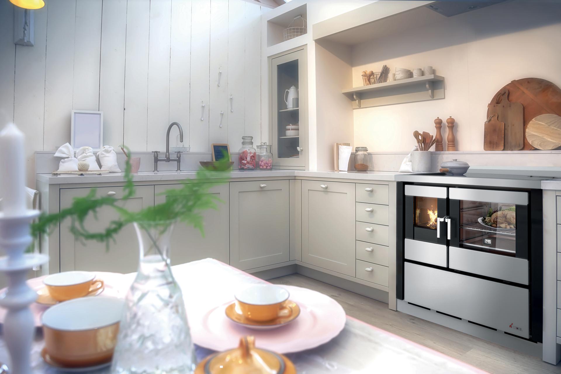 The striking element of this fitted wood cooker is the space devoted to the oven, the wide glass through which you can see the food cooking and the wide firebox, so you can have everything under control. The big, stainless steel oven ensures food is cooked evenly and the appliance is easy to clean, while the hob made of cast iron as standard is also available in a glass ceramic version.
