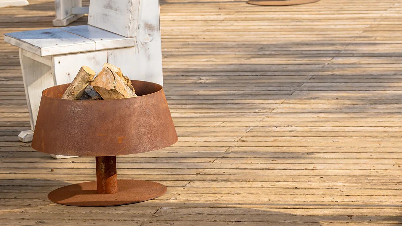 Lampada bassa brazier blends the elegance of contemporary decor with the practicality of an outdoor fire feature. Rust-effect steel.