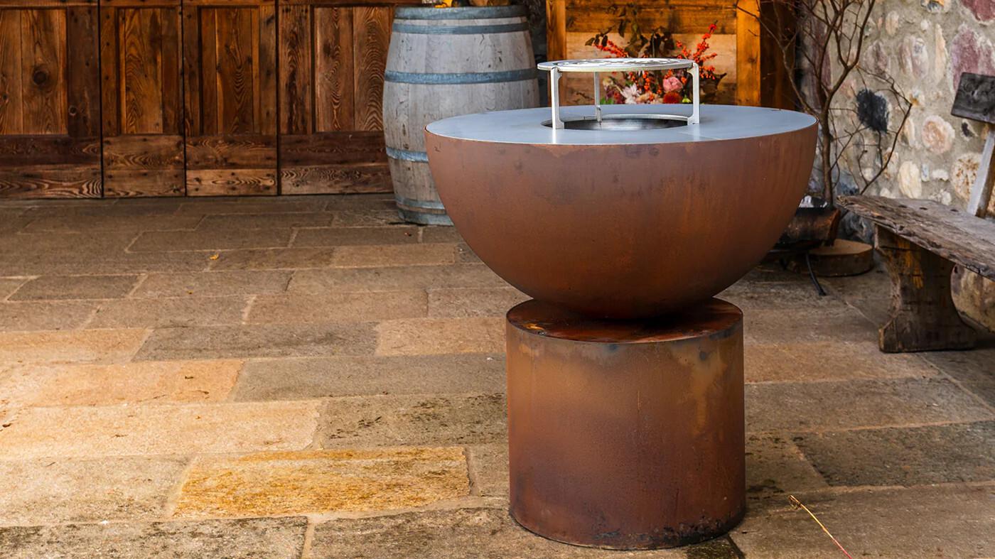 Barbecue Primula with elegant yet sturdy base highlights the iconic design of the half-sphere brazier. Rust-effect steel.
