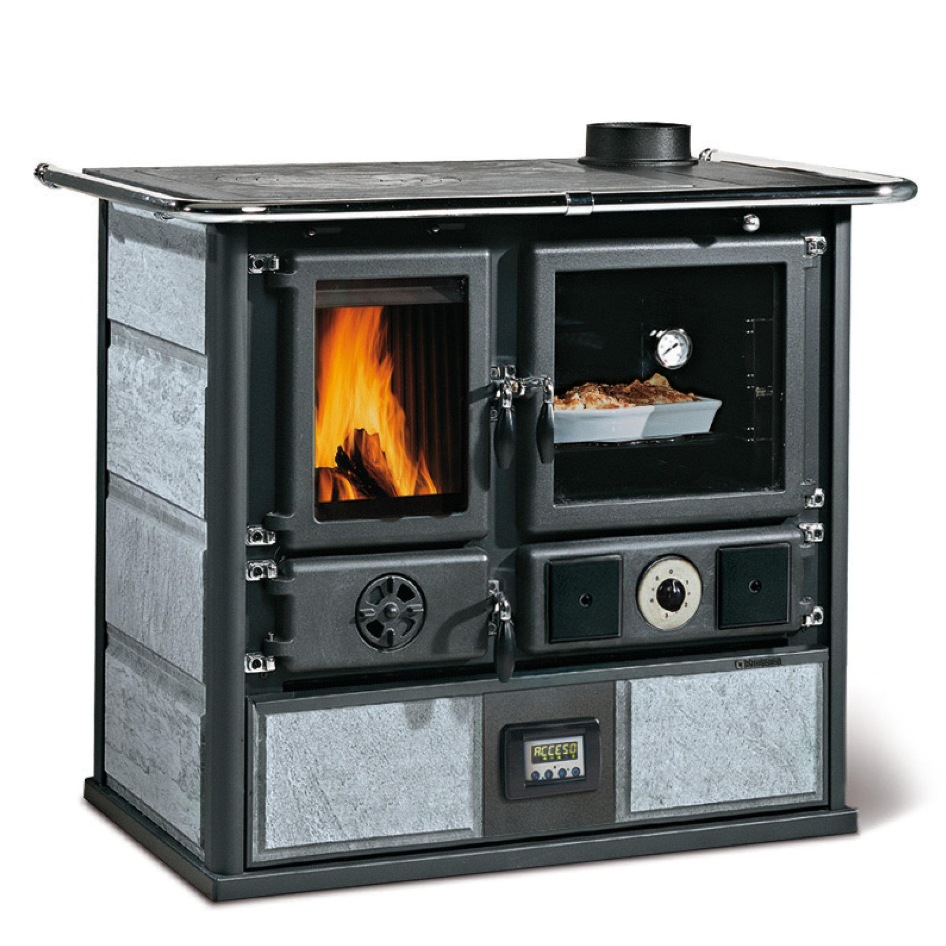 A wood-burning cooker that connects to the heating and plumbing system, efficiently and ecologically heating the entire house with an excellent heat output, low wood consumption and complete respect for the environment. wood consumption and with complete respect for the environment. Equipped with a large oven and cast-iron rim plate for cooking.