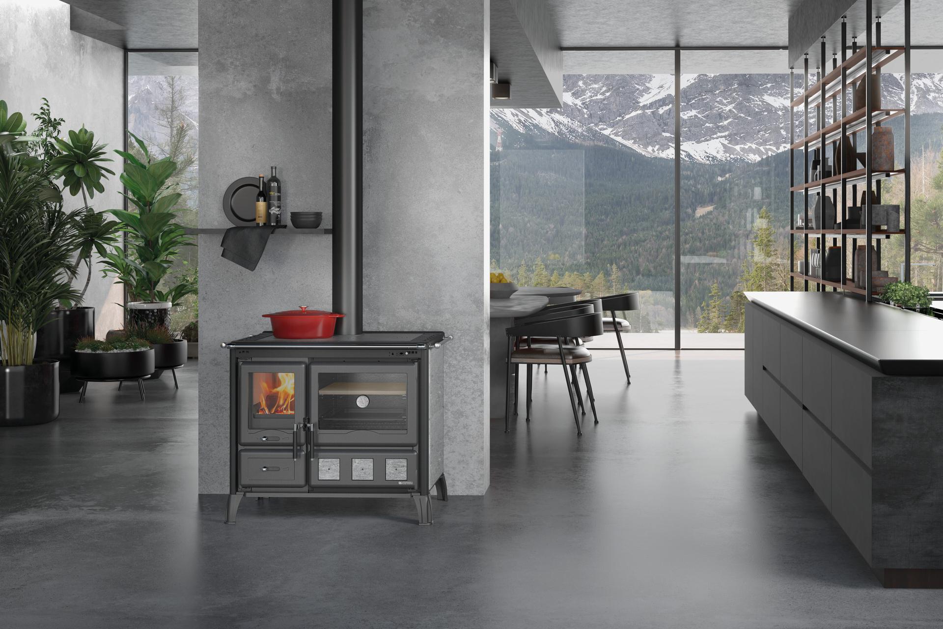 The Gardenia XXL woodburning cooker has a large cast-iron oven. The inside of the oven is made of polished enameled cast iron and allows several dishes to be cooked at the same time. The oven is complete with a pizza oven mounted on pull-out rails.