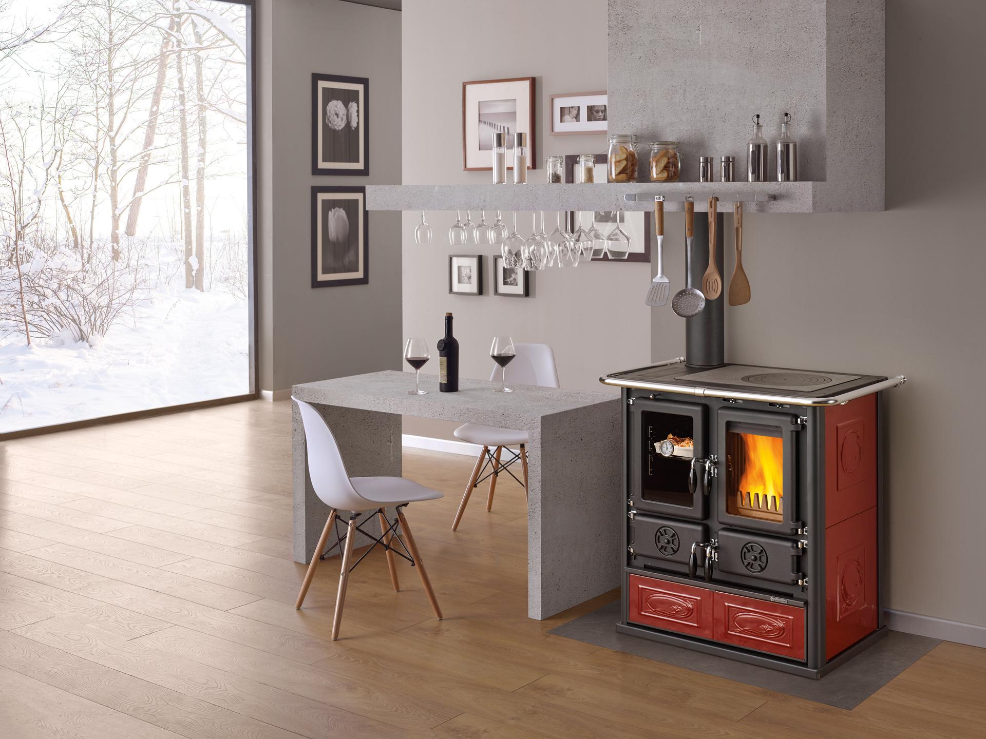 Wood burning cooker with natural stone facade and upper left or rear left smoke outlet. Top cooking plate and rings in polished cast-iron. Internal facing of the hearth in cast iron and refractory. Extractable wood drawer. Fire door in cast iron. Ceramic glass.