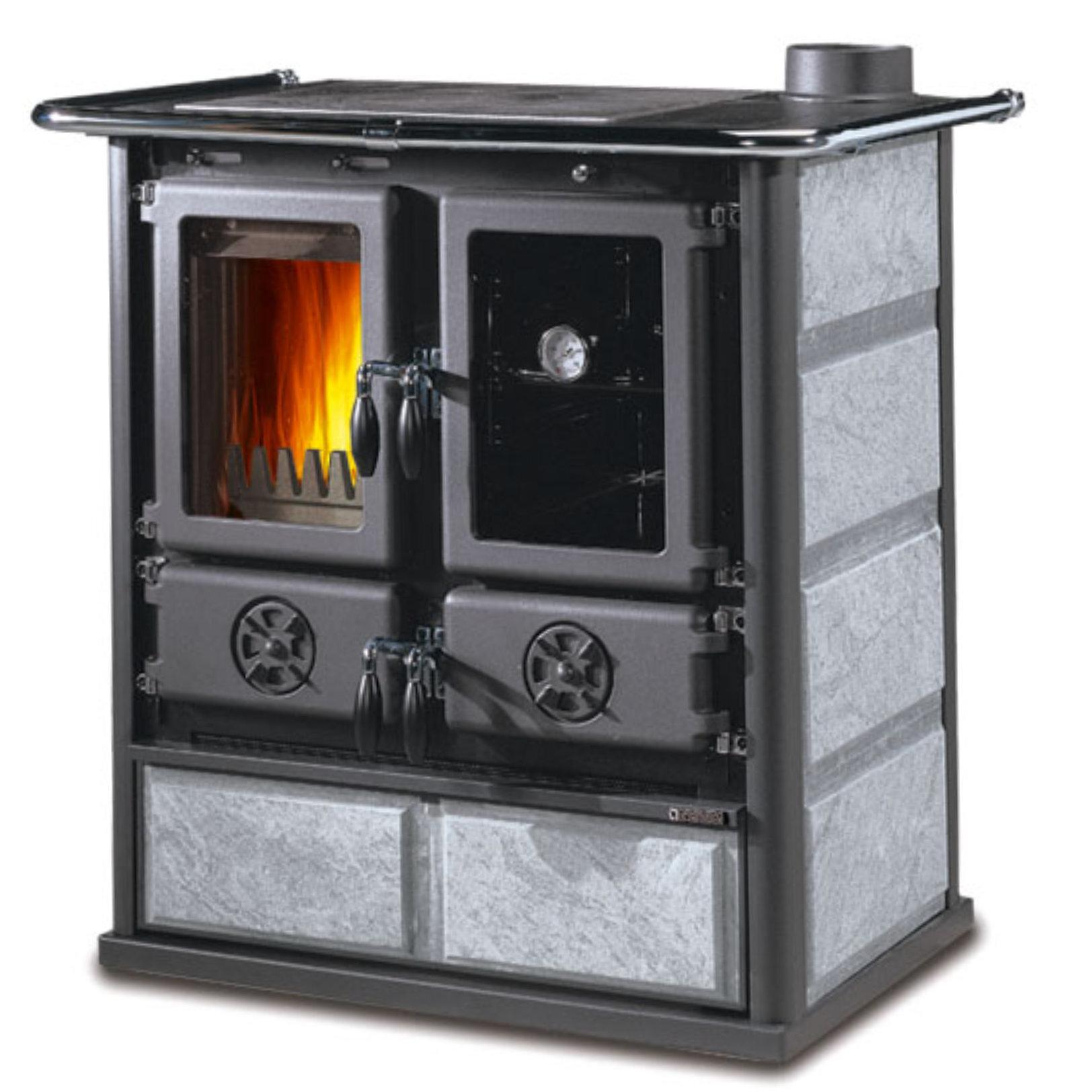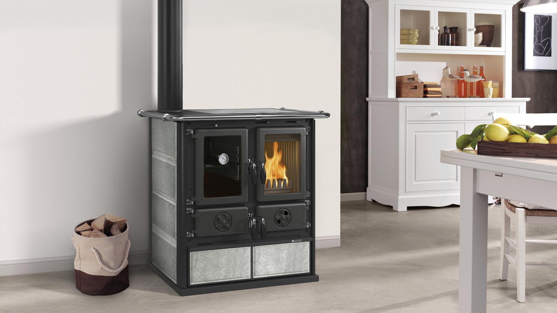 Rosetta Sinistra 5.0 is distinguished by its smoke outlet on the left side, a concrete response to specific installation requirements. Its cast iron hearth and 28-litre oven combine elegance and performance, warming the room while cooking dishes with authentic flavour.
