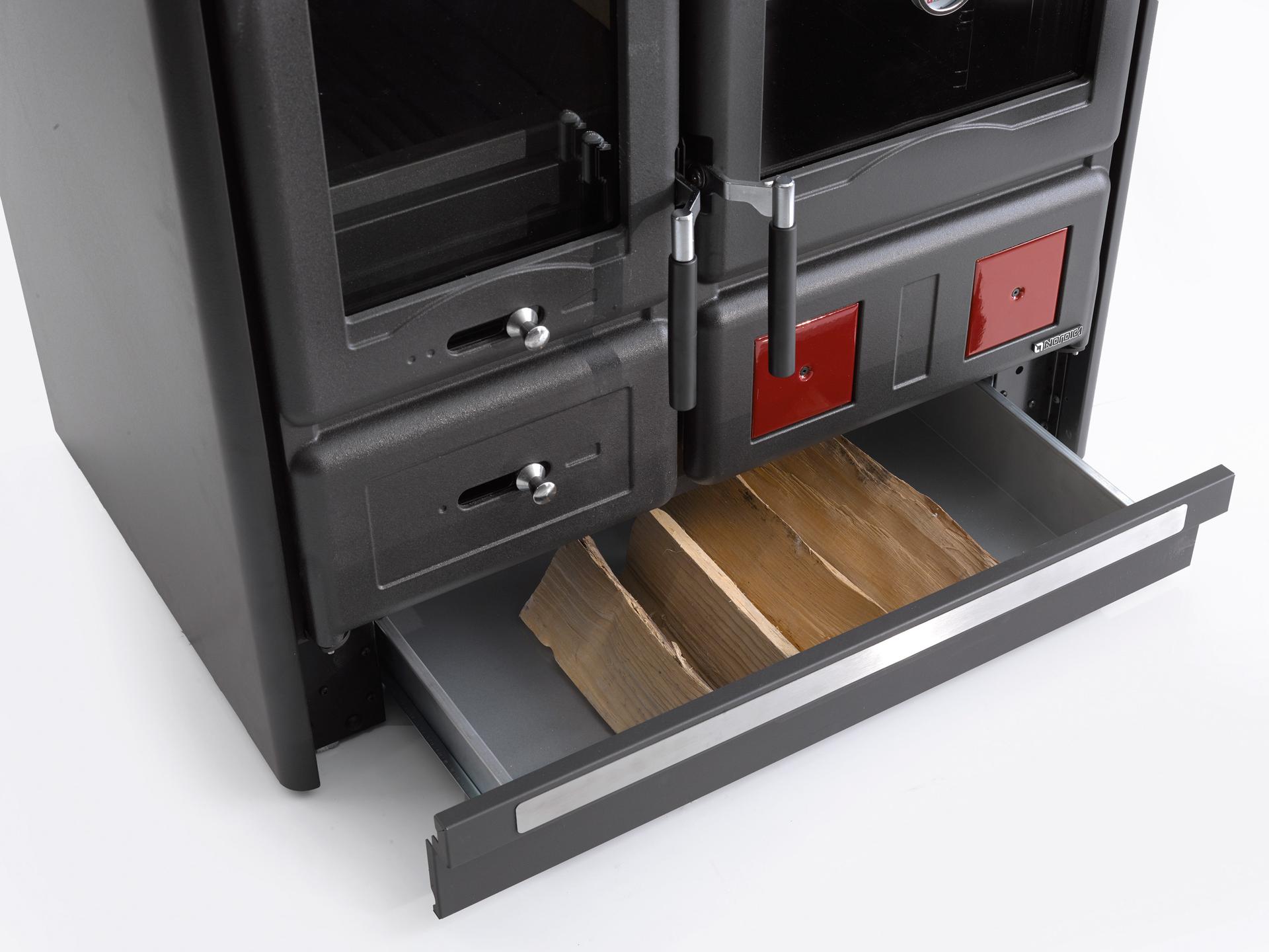 Traditional wood burning cooker with top cooking plate and rings in polished cast-iron. Internal facing of the hearth in cast iron and refractory. Extractable wood drawer. Fire door in cast iron with double glass. As standard a kit of 2 black tiles 10x10 cm.