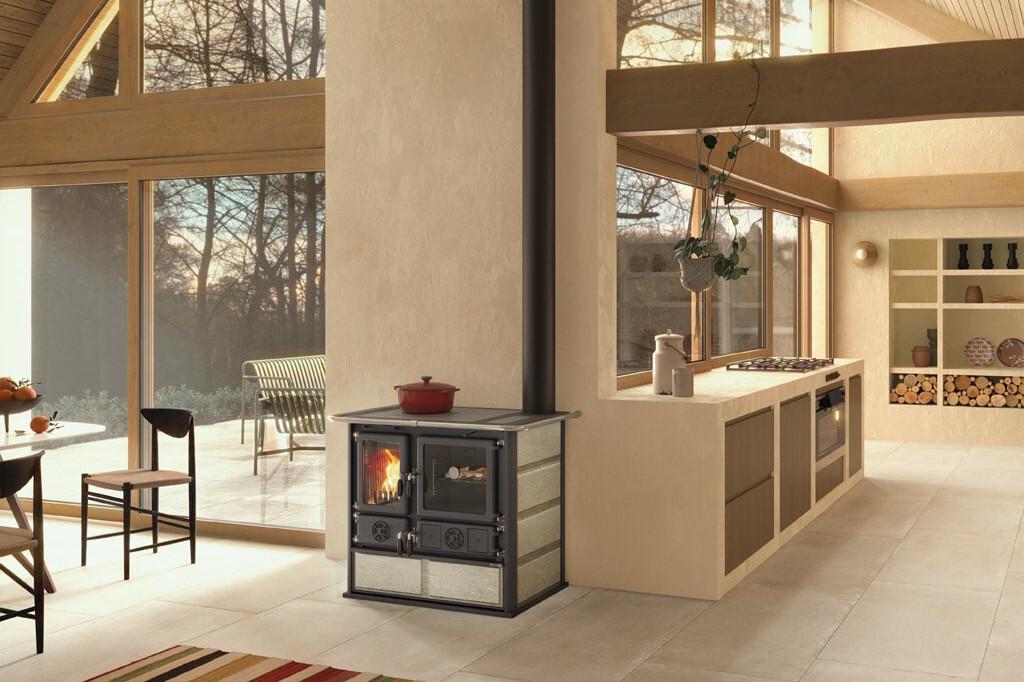 Traditional design wood-burning cooker with natural stone facing. The top plate and the rings are in polished cast iron. The doors and frames are in enameled cast iron. A spacious enamelled steel oven for baking.