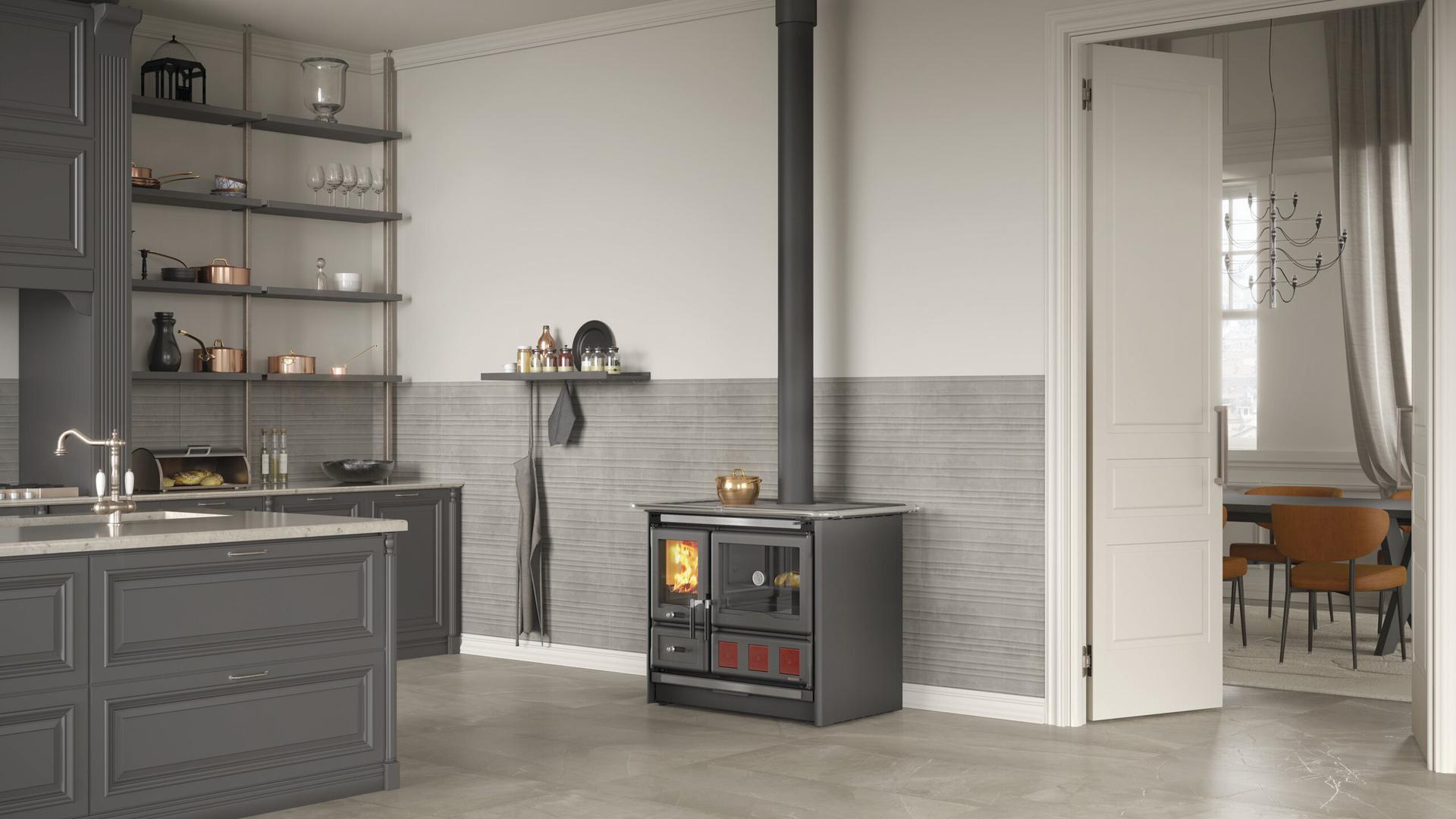 Rosa XXL, with its large 78-litre enamelled oven and porcelain-coated steel panelling, combines functionality with a durable structure. Available in bordeaux and infinity white, it is perfect for furnishing your kitchen, while the double glass and wood drawer enhance its value and practicality.