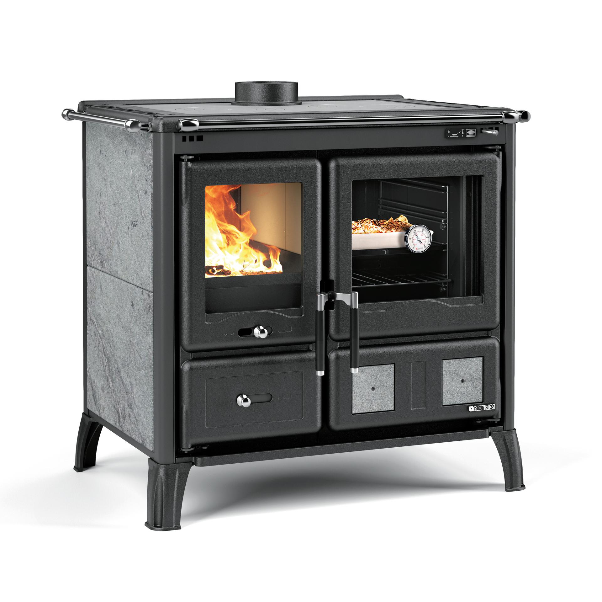 The new chrome handle, ventilated sides in enameled natural stone, firebox with Nordiker refractory sides and cast iron base, enameled ashtray and enameled cast iron feet enhance the luxurious look and sophisticated function of this cooker. The enameled cast iron front, frame and door, complemented by the newly designed handles, give a real sense of uniqueness and elegance.