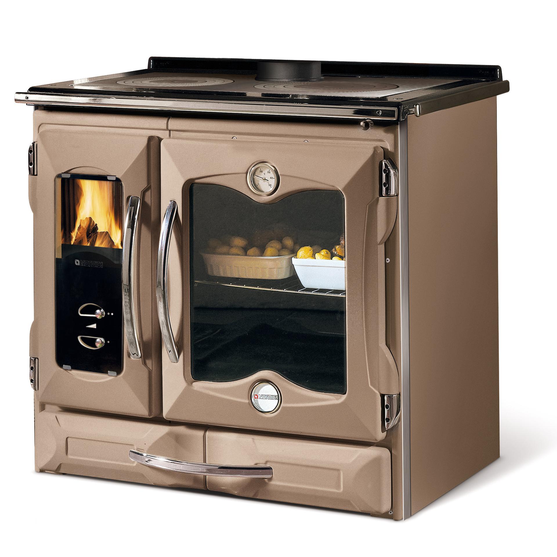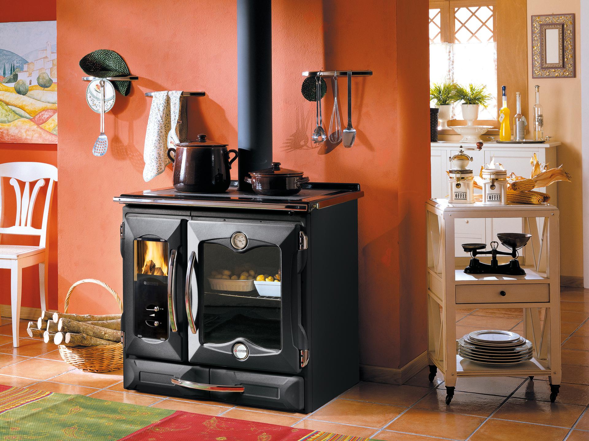 Wood cooker with large enamelled steel oven and big doors. Internal facing of the hearth in cast iron and Nordiker. Top cooking plate with three rings in polished cast-iron. The doors, facade and frame are made of enameled cast iron, which if used correctly has almost an unlimited life and it requires a minimal maintenance.