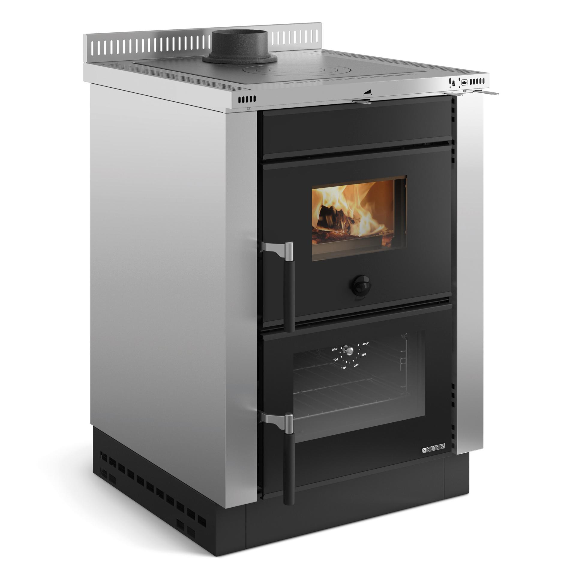 Insertable or free-standing wood burning cooker with staineless steel facade and reversibile doors. Cast iron fire door with triple glass. Ceramic glass. Internal facing of the hearth in cast iron and Nordiker. Top cooking plate and rings in polished cast-iron.