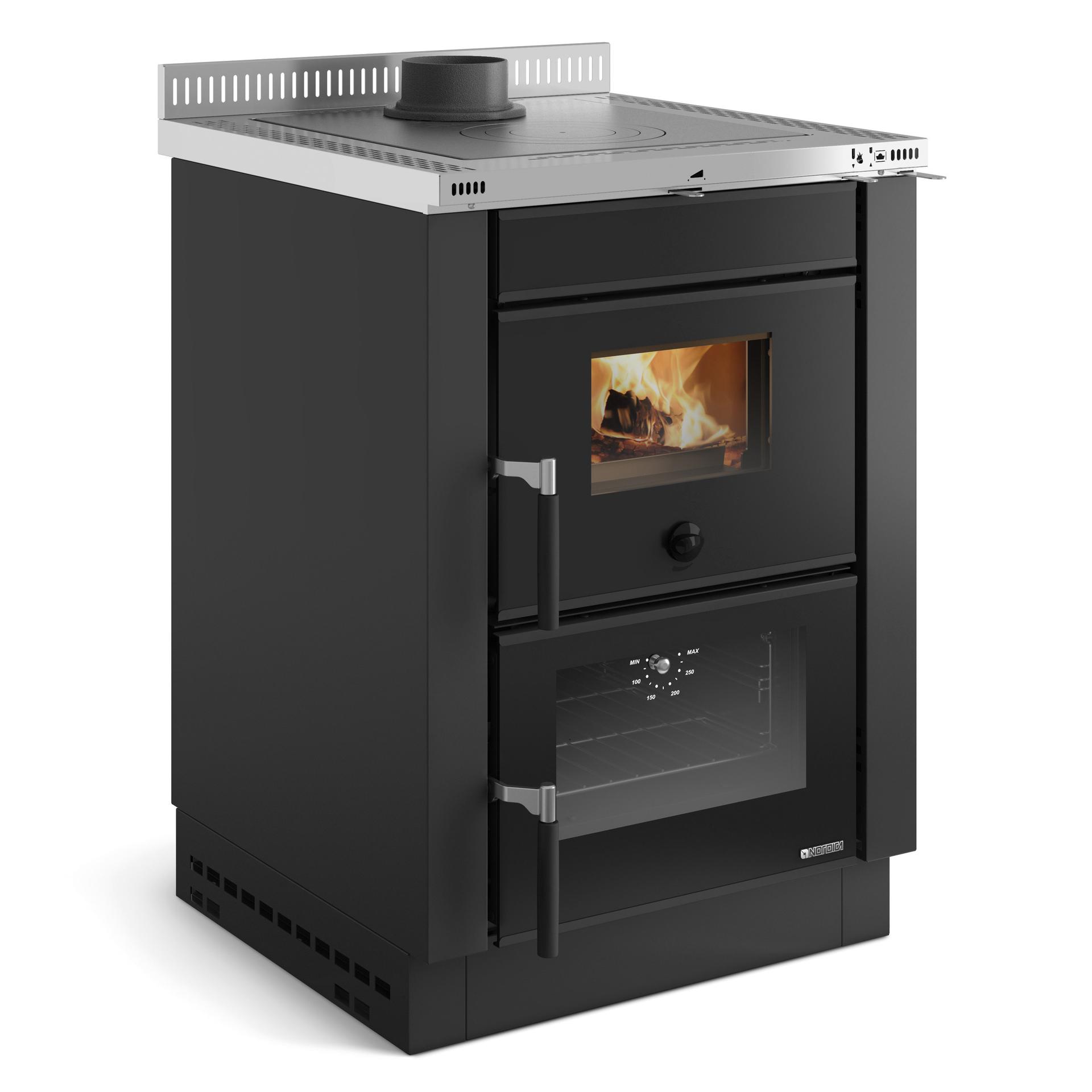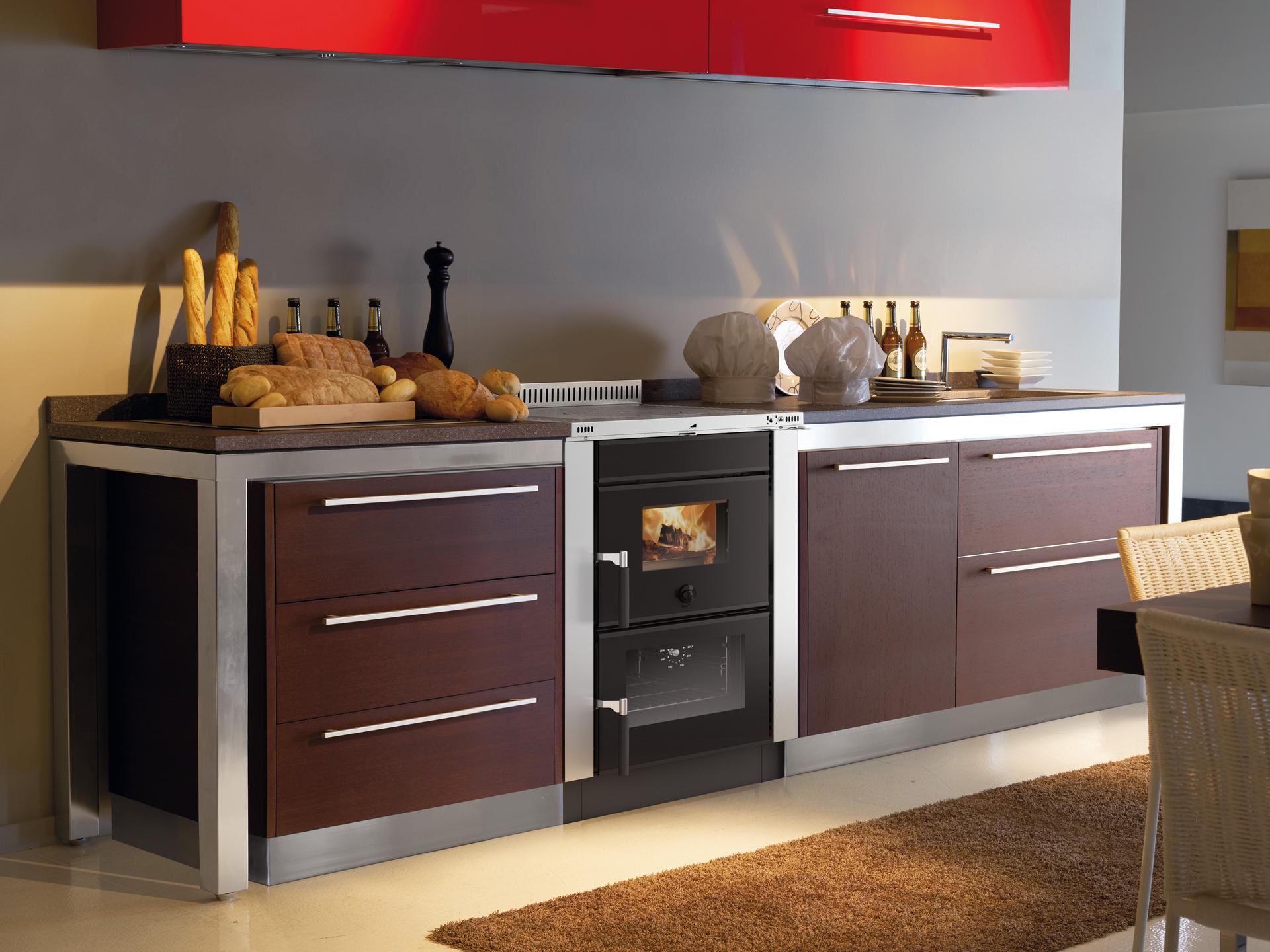 Insertable or free-standing wood burning cooker with enameled steel facade and reversibile doors. Cast iron fire door with triple glass. Ceramic glass. Internal facing of the hearth in cast iron and Nordiker. Top cooking plate and rings in polished cast-iron.