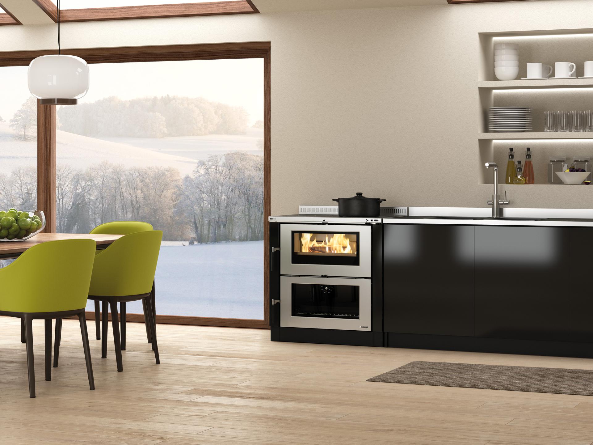 Insertable or free-standing wood burning cooker with a wide fire vision and possibilty to use 50 cm logs. Stainless steel facade. Internal facing of the hearth in cast iron and Nordiker. Top cooking plate and rings in polished cast-iron. Cast iron fire door, oven door in enamelled steel. Stainless steel frame. Extractable wood drawer. Ceramic glass. Frontal handrall. Top thickness 3 cm.
