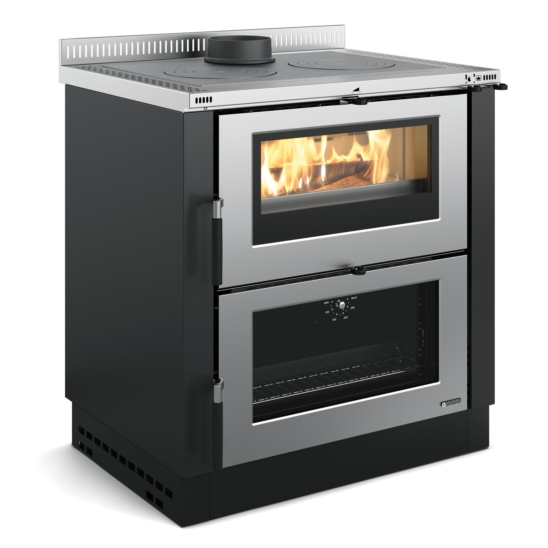 Insertable or free-standing wood burning cooker with a wide fire vision and possibilty to use 50 cm logs. Enameled cast iron facade. Internal facing of the hearth in cast iron and Nordiker. Top cooking plate and rings in polished cast-iron. Cast iron fire door, oven door in enamelled steel. Stainless steel frame. Extractable wood drawer. Ceramic glass. Frontal handrall. Top thickness 3 cm.