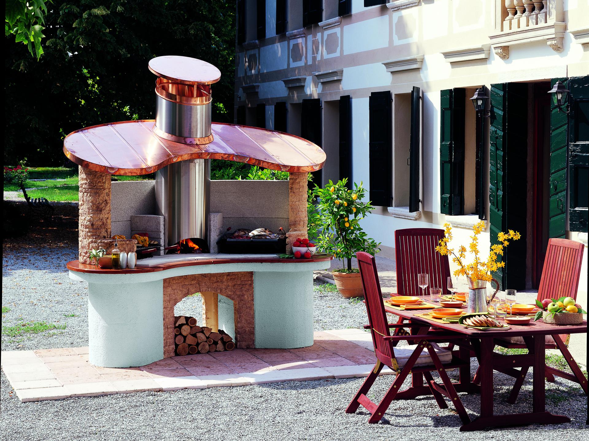 If you have no space problems and want something truly unique and exclusive, this is the barbecue for you. Elegantly finished in technical stone with a copper roof, it has a double cooking station so you can try out different cooking techniques at the same time. A special feature is the central stainless steel combustion chamber with rear loading of wood, which allows the continuous production of embers to be used on both stations.