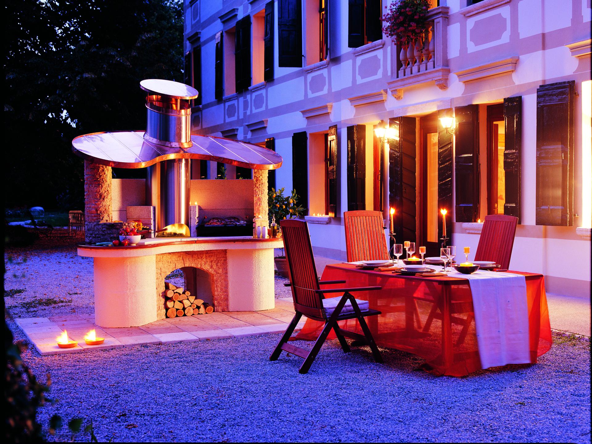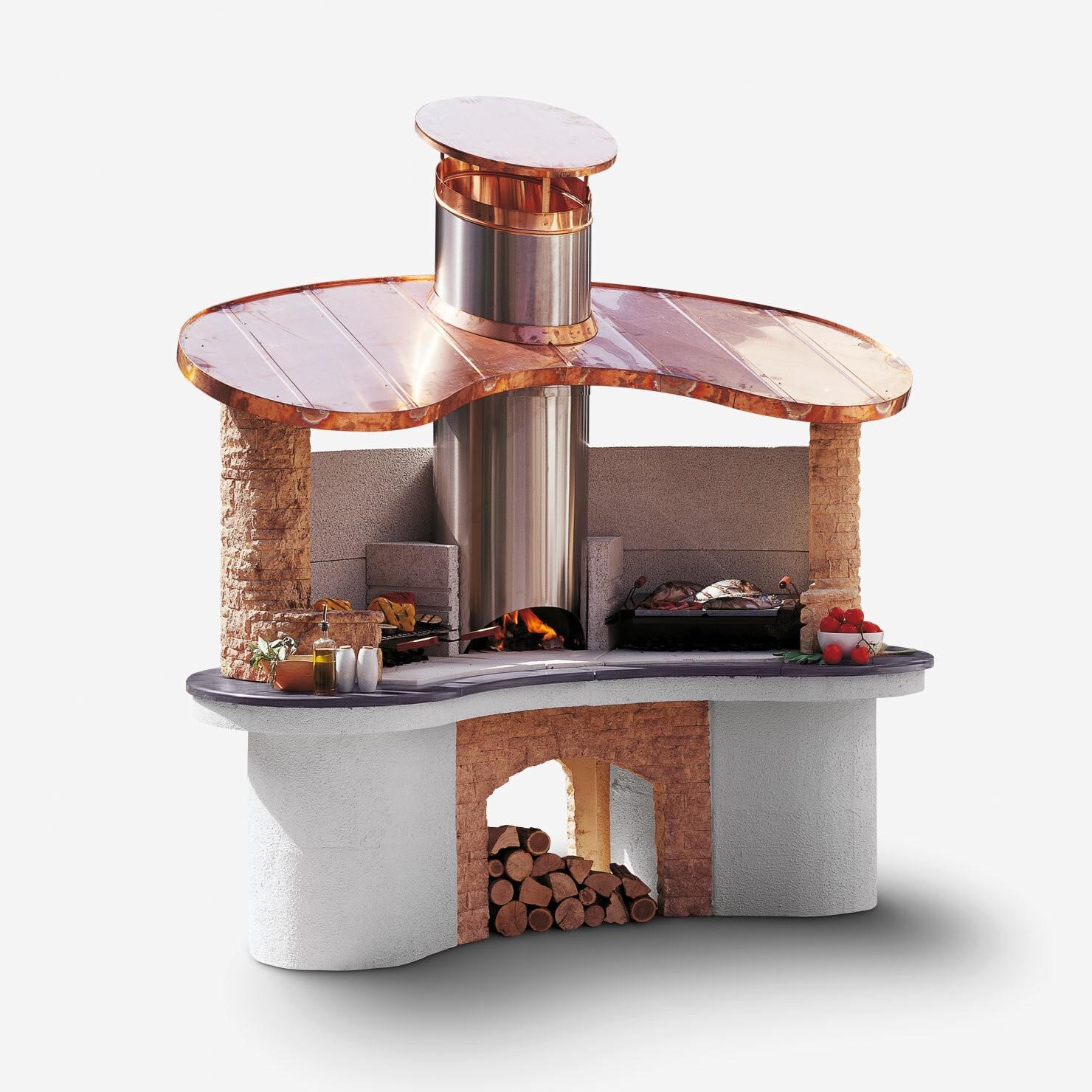 If you have no space problems and want something truly unique and exclusive, this is the barbecue for you. Elegantly finished in technical stone with a copper roof, it has a double cooking station so you can try out different cooking techniques at the same time. A special feature is the central stainless steel combustion chamber with rear loading of wood, which allows the continuous production of embers to be used on both stations.