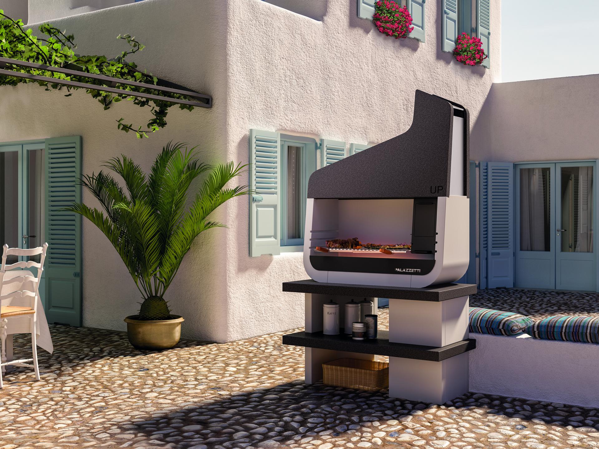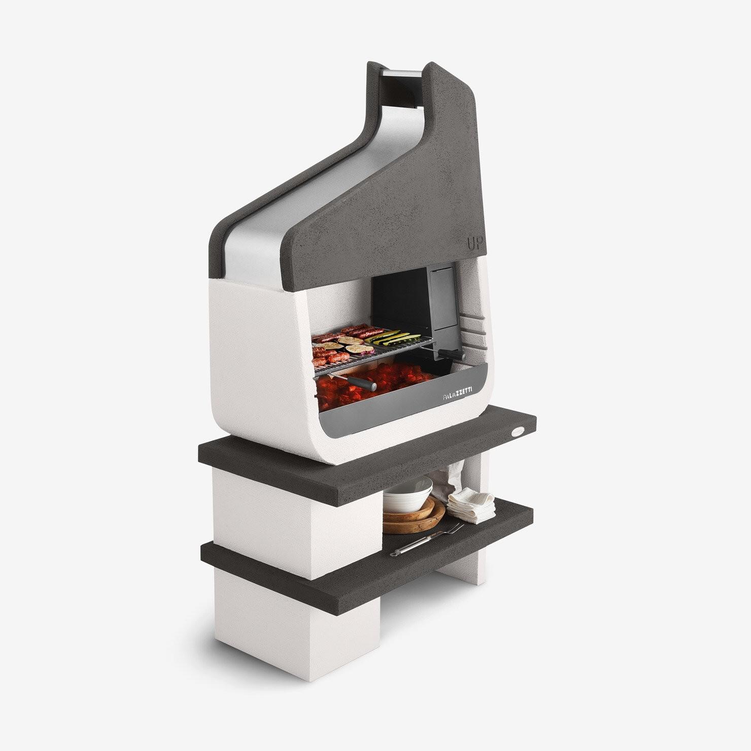 A unique barbecue with a futuristic design that can be placed on top of an existing table or fitted to its base. The Up barbecue can be completed with a special side brazier (optional) with two compartments: one with a lockable door for loading and lighting wood, the other for producing embers which, when ready, can be conveniently dropped into the grilling area by simply pulling the trapdoor with the special tool.
