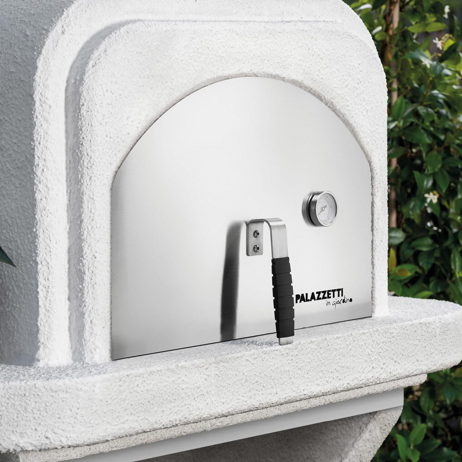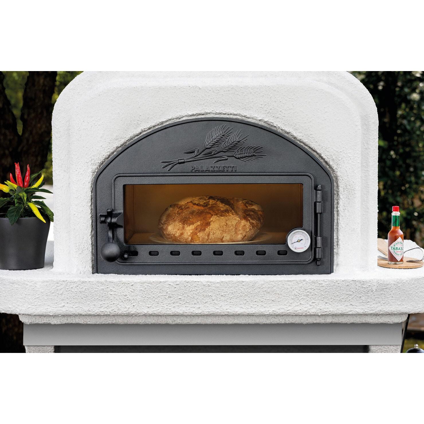 Patented stainless steel oven (45x45 cm) with a chamotte base, heated by grill exhaust gases