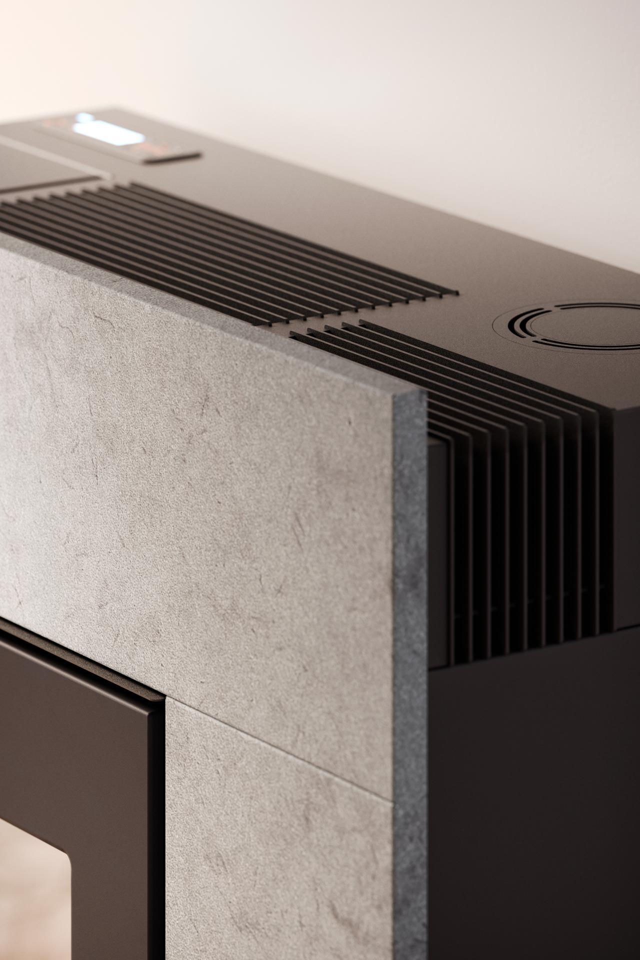 High performance, ductable with rear smoke outelt. Minimalist design with 2 ventilation grilles installed in the lower front section for improved air distribution. Serpentino stone cladding.