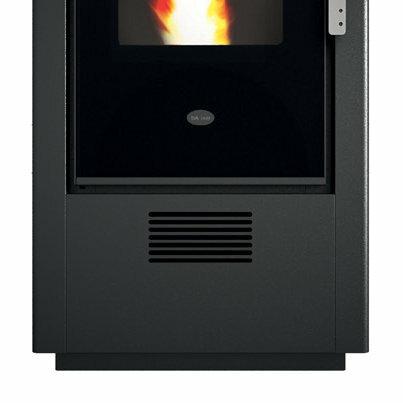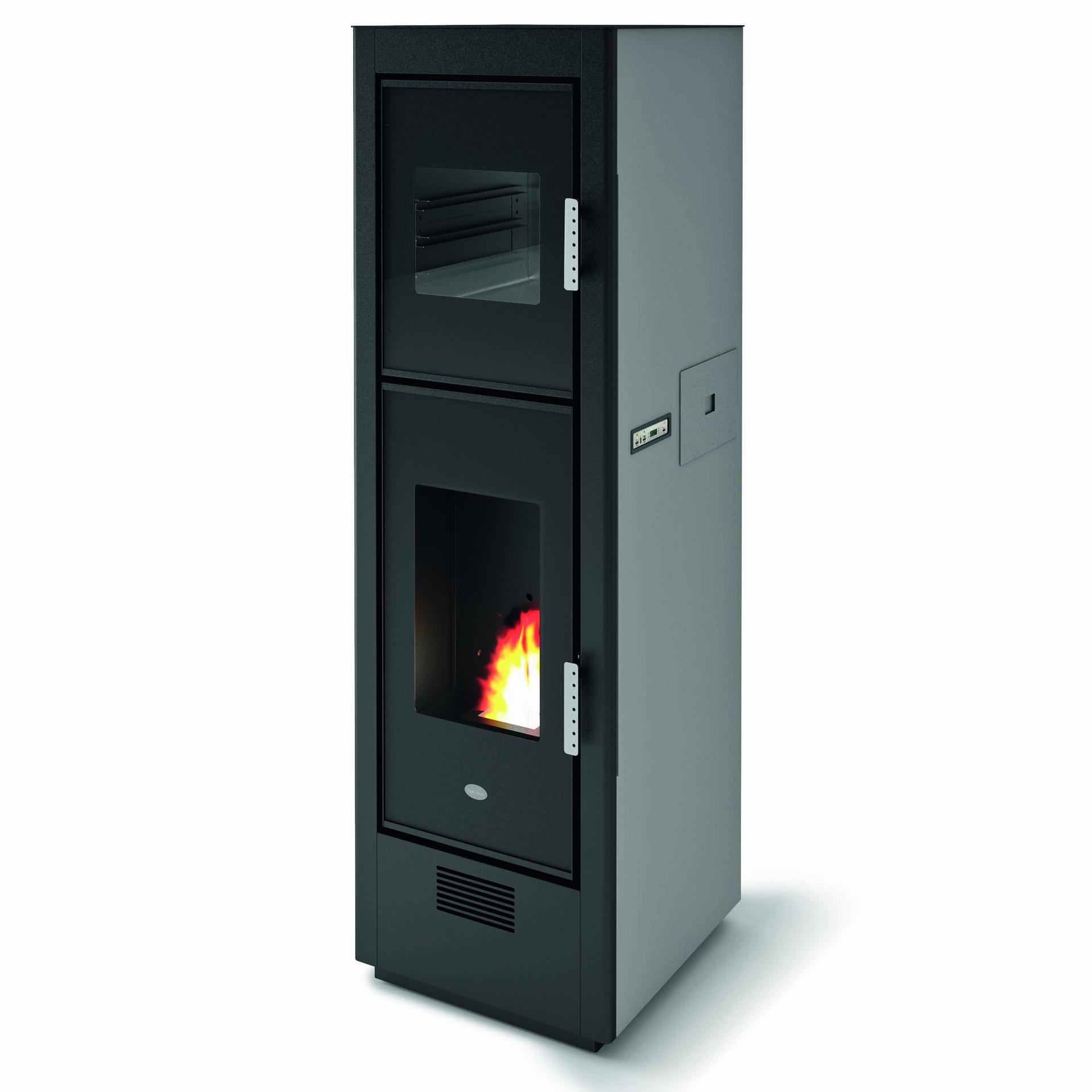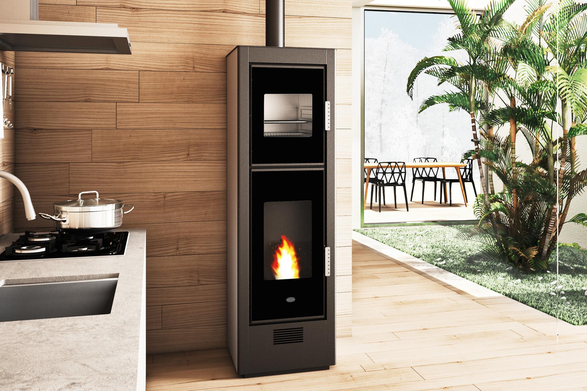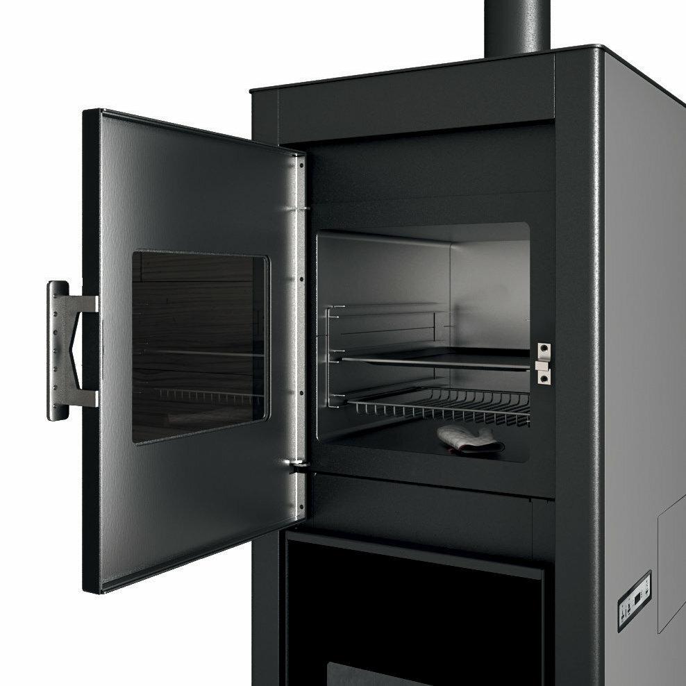 Heating and baking with a single pellet stove. Compact and elegant design with rear and top flue connections for easy integration into your living space. Large doors with black printed glass. The stainless steel oven includes removable tray holder guides, aluminium tray and tray holder grille. The baking temperature is controlled by a display with a range of 120 to 240°C. 5 power levels are managed by the menu display in 6 languages.