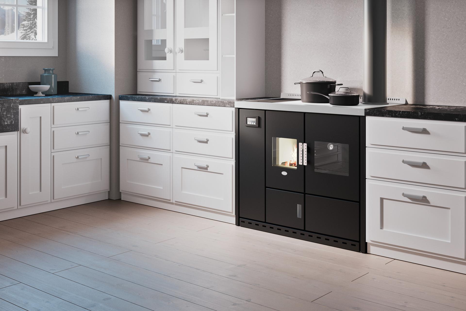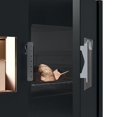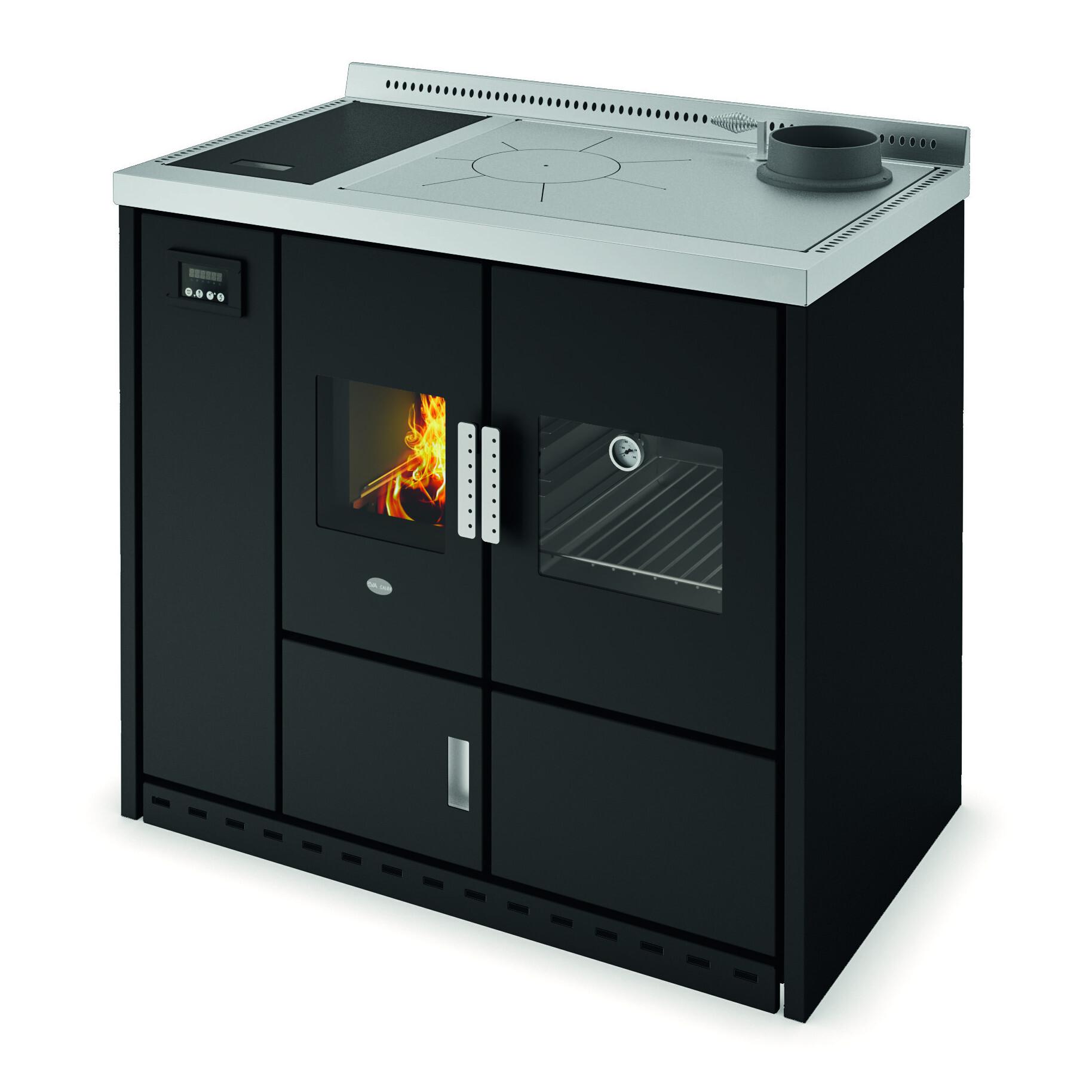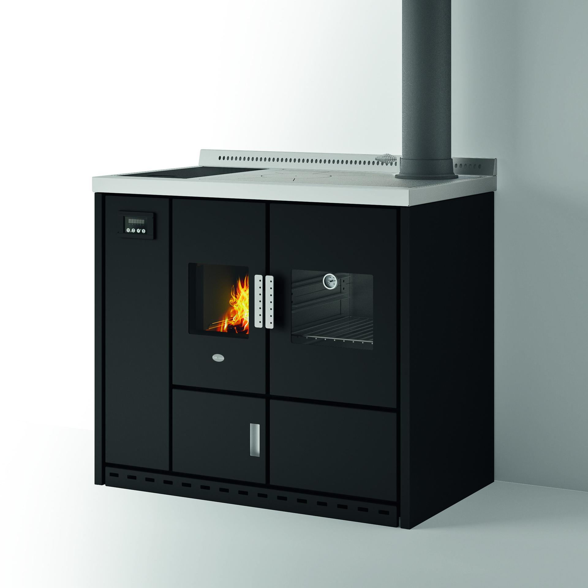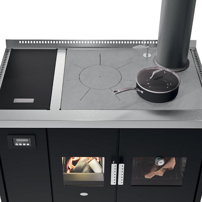 Central heating, cooking and baking with the single unit that can be a freestanding or a built-in unit. The stainless steel oven with thermometer includes removable tray holder guides, an aluminium tray and a tray holder grid. The combustion chamber can be reduced in size for use during the summer months. The thermo cooker is equipped with a stainless steel coil, circulation pump, anti-spill valve and solenoid valve for automatic loading. The open-tank exchange system and the closed-tank connection system provide an additional level of efficiency and safety.
