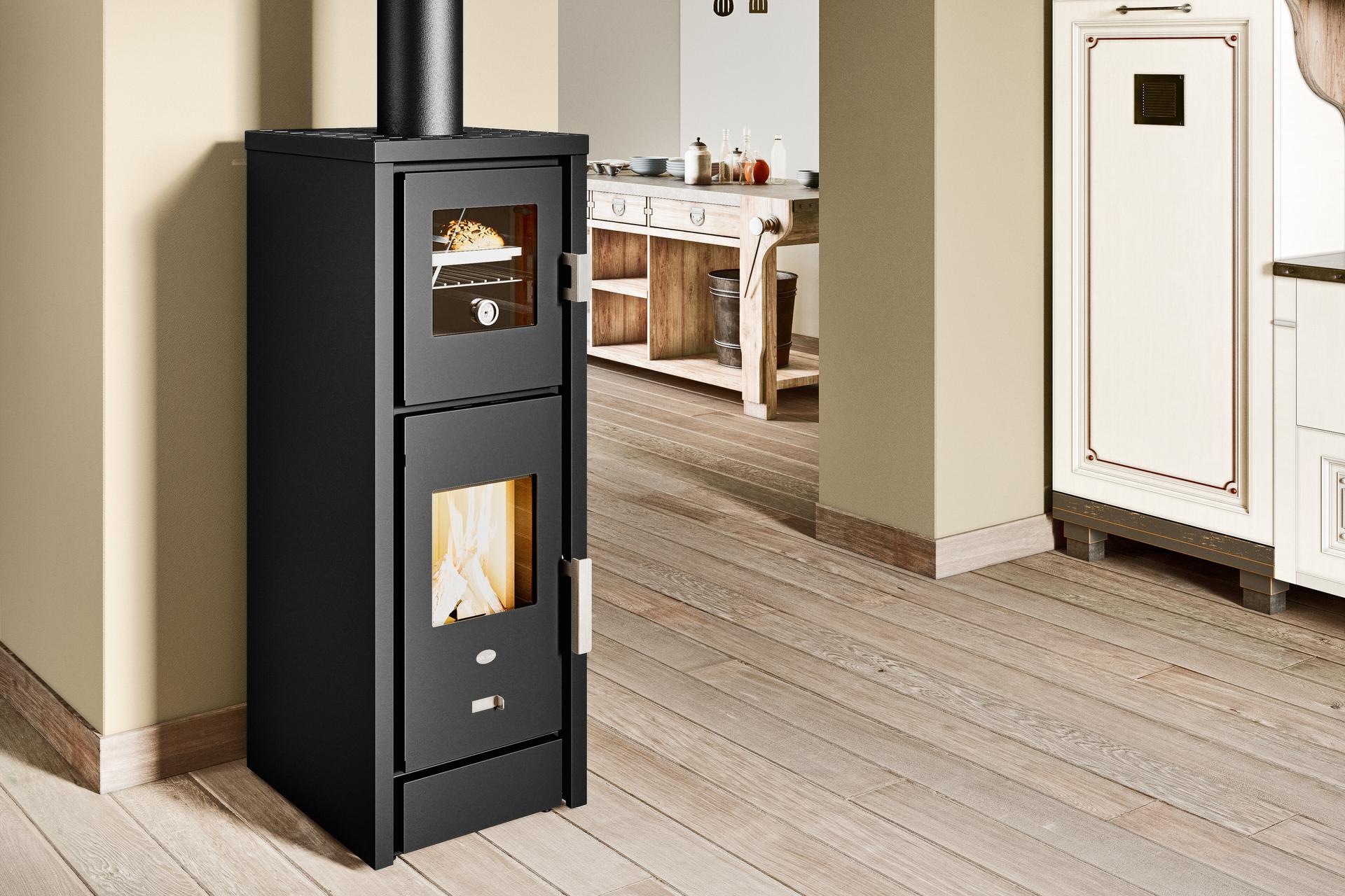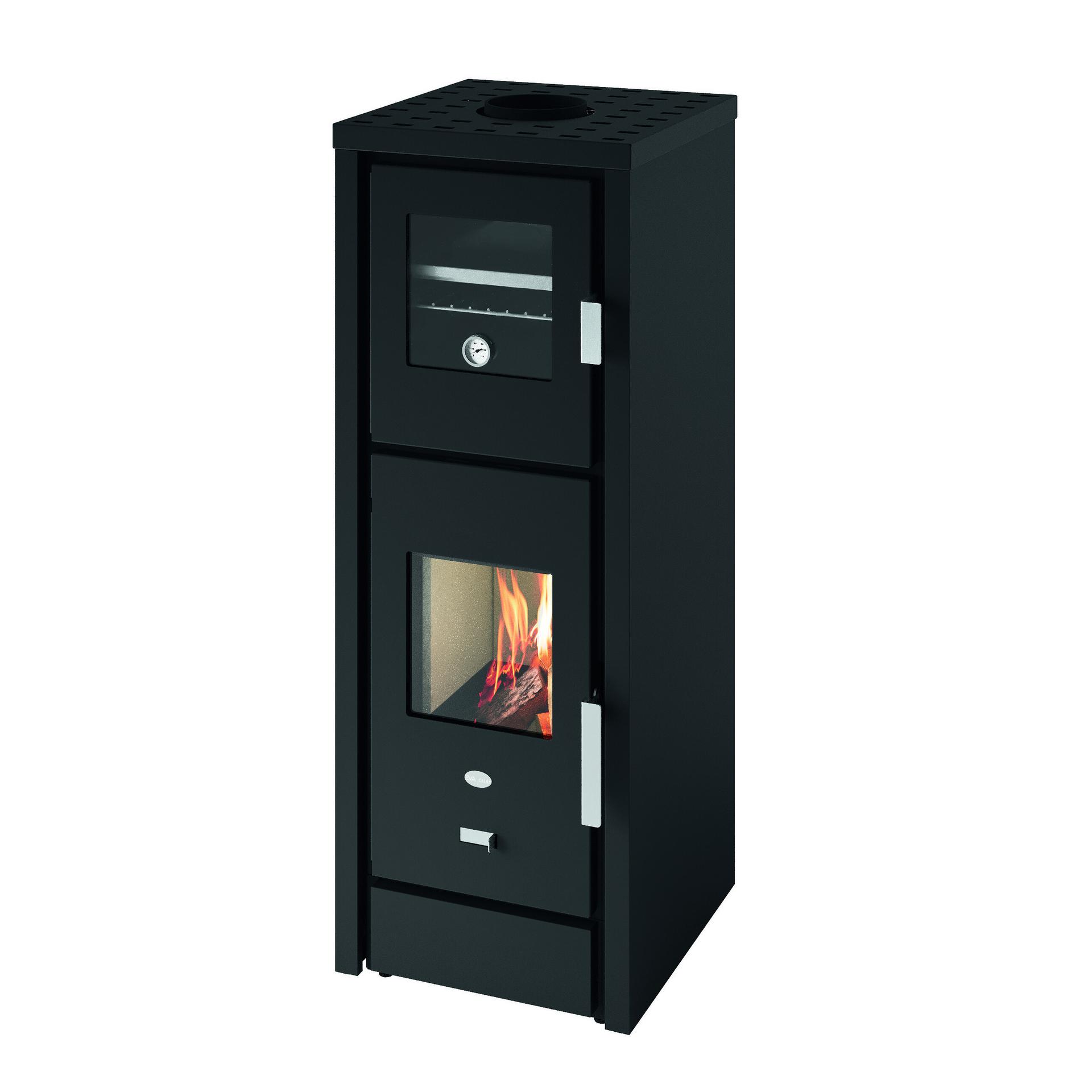 Wood-burning stove with a stainless steel oven that includes removable guides for the tray holder, an aluminium tray and a tray holder grille. Vermiculite combustion chamber and air supply control. Removable ash drawer for ash collection in a separate compartment. Top flue connection.