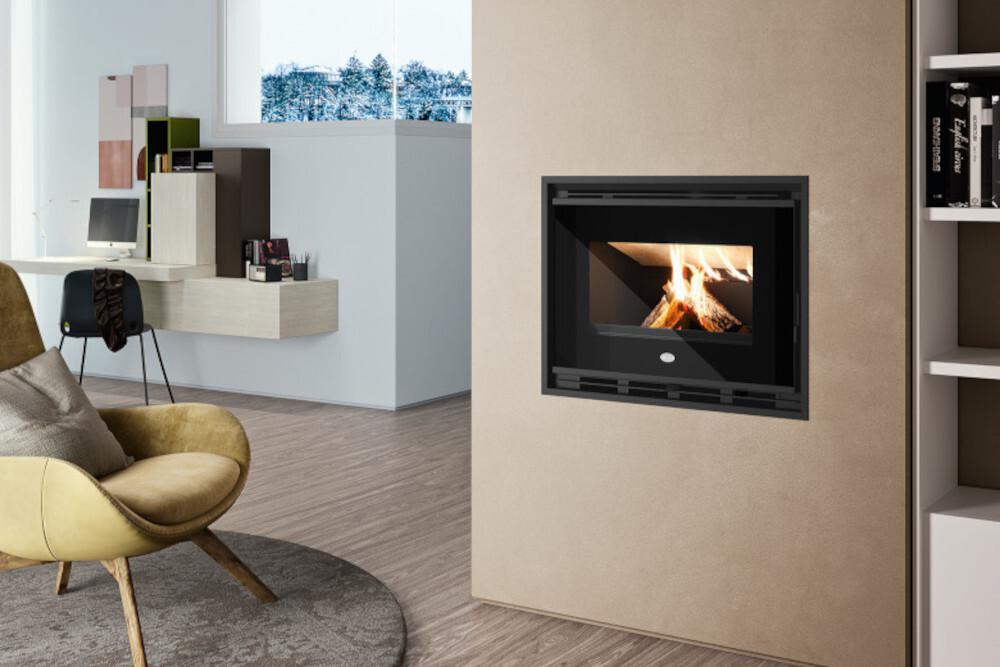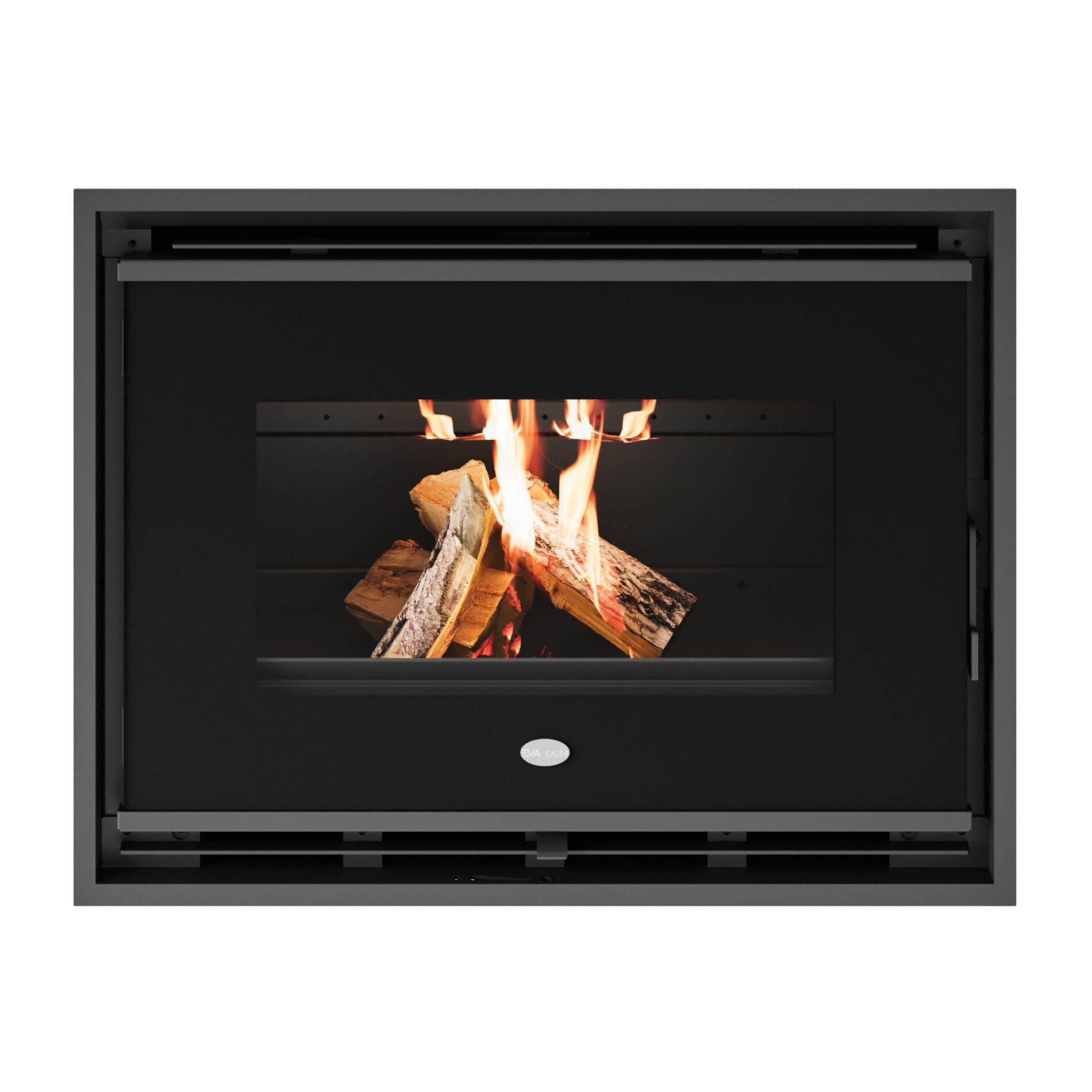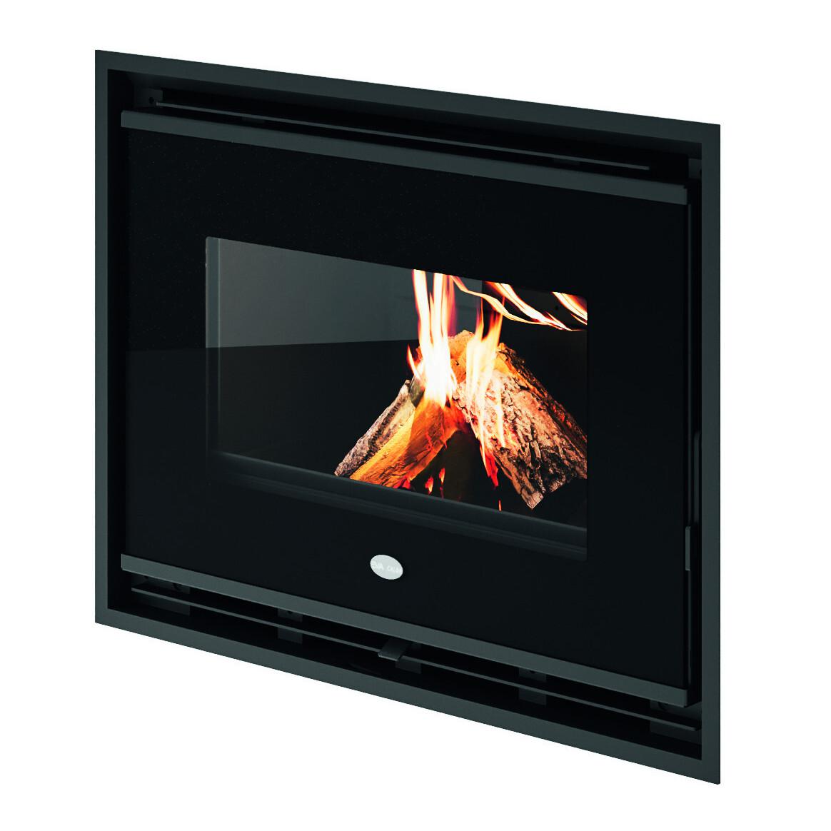 Wood-burning insert with vermiculite combustion chamber. Linear design with black printed glass front door and removable handle.