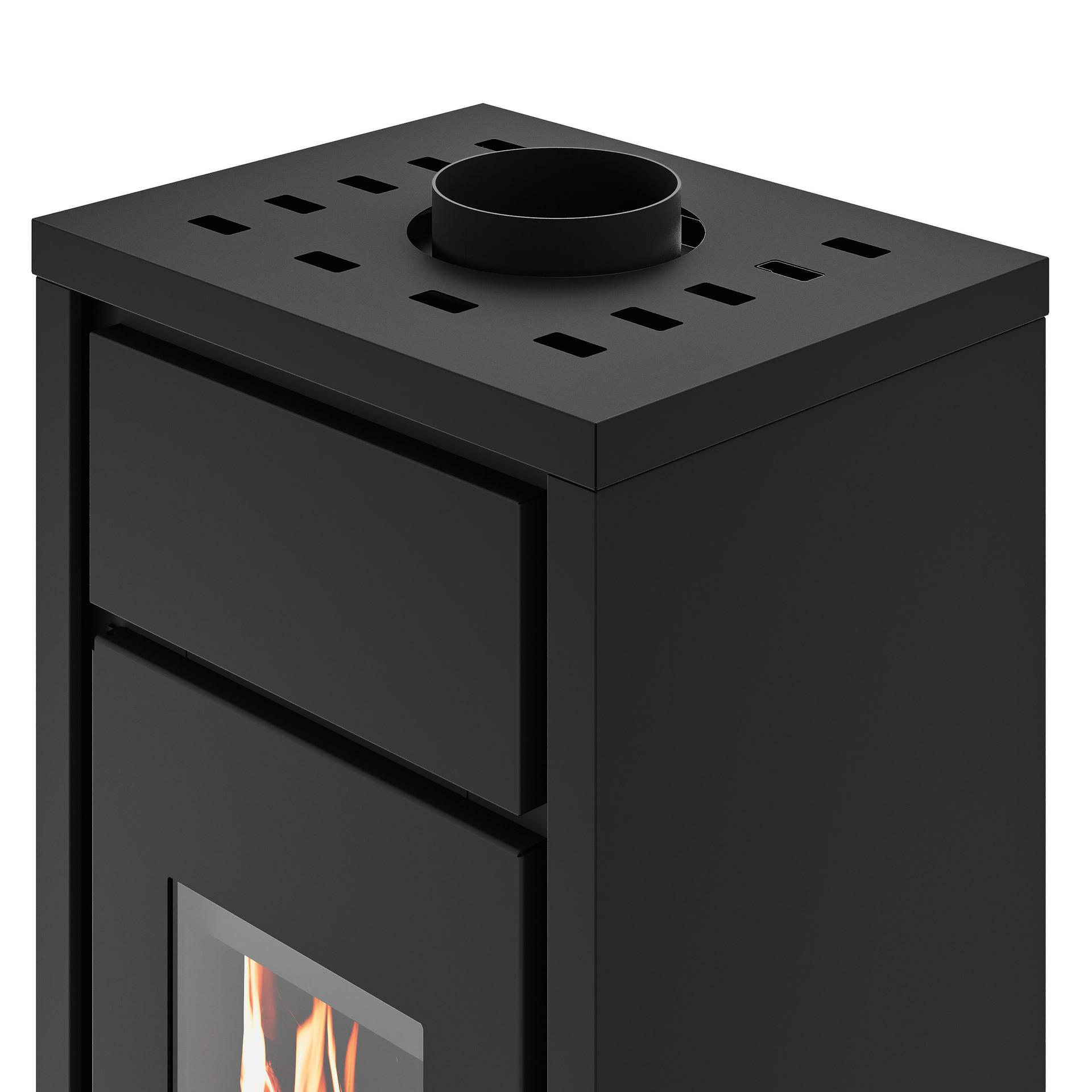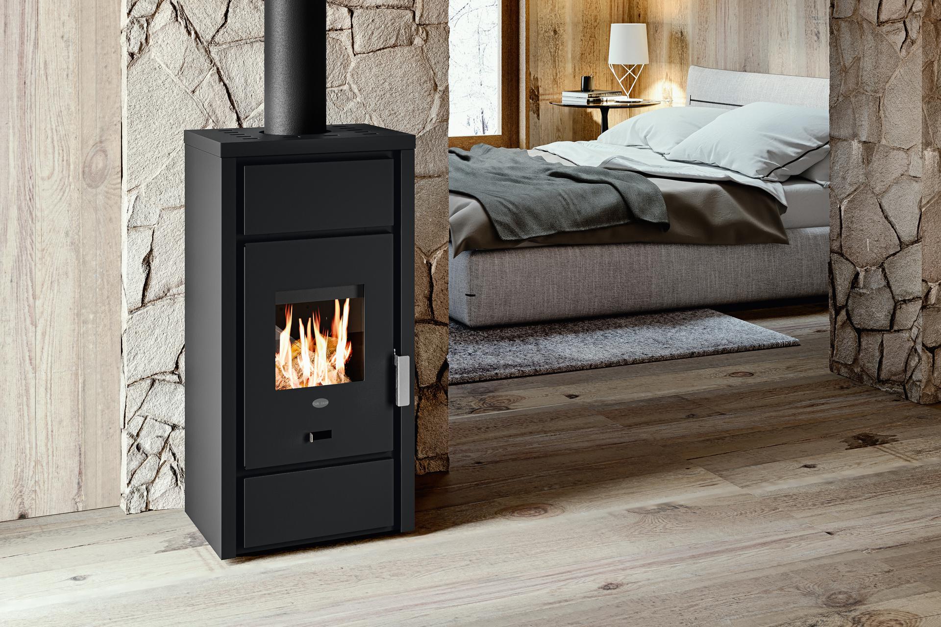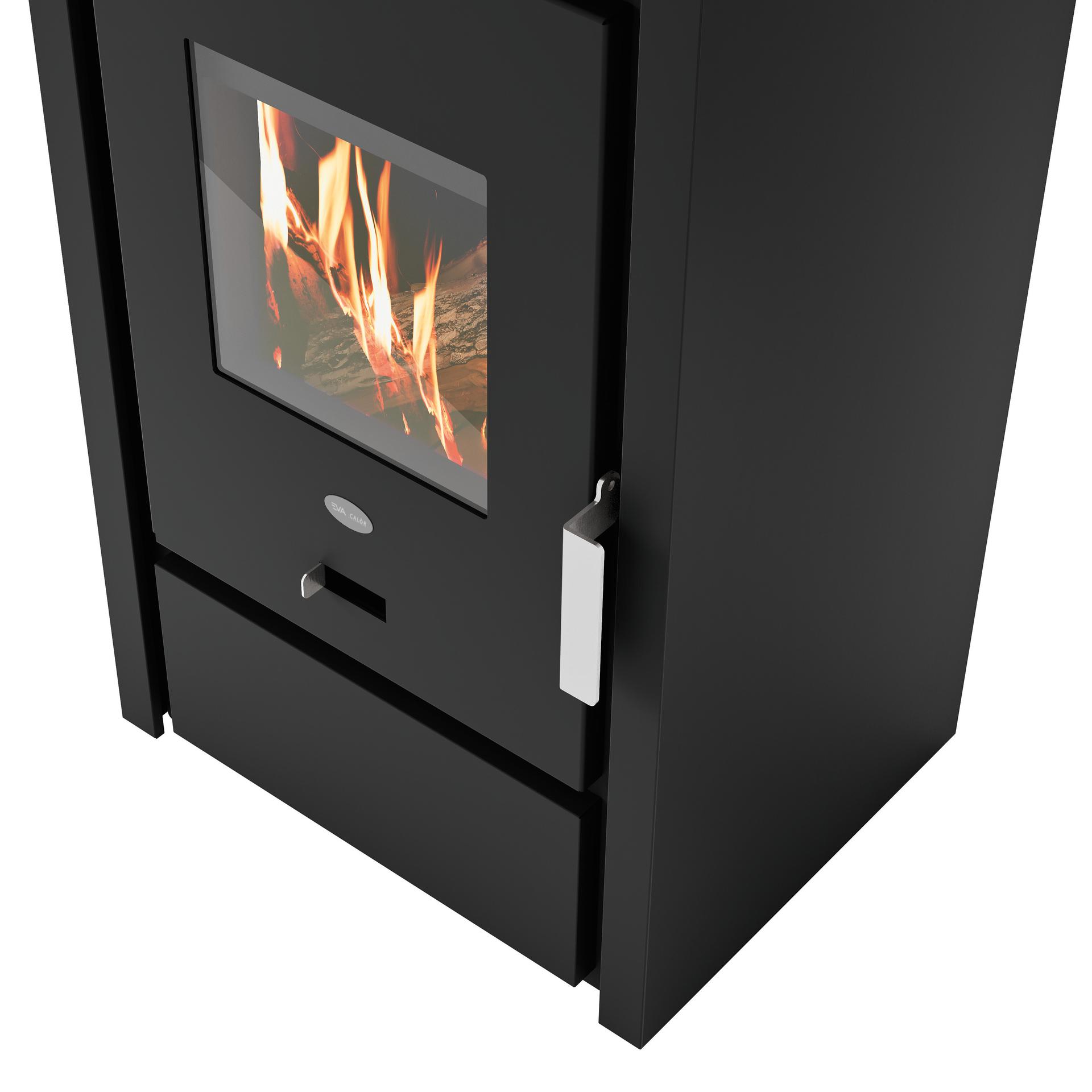Compact and essential design with steel casing. Vermiculite combustion chamber and combustion air regulation. Removable ash drawer for ash collection in a separate compartment. Top flue connection.