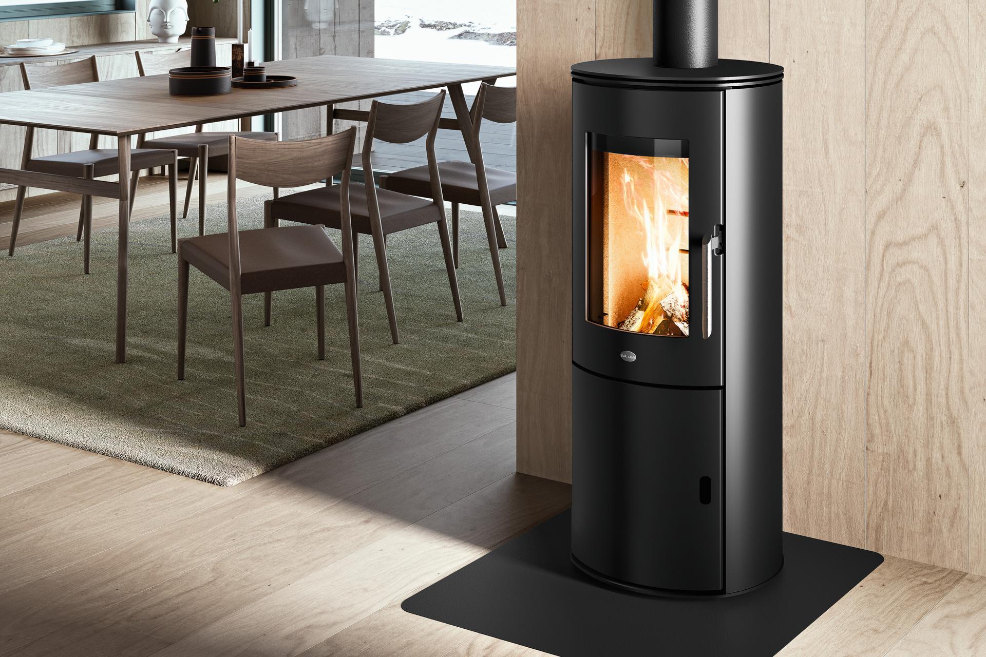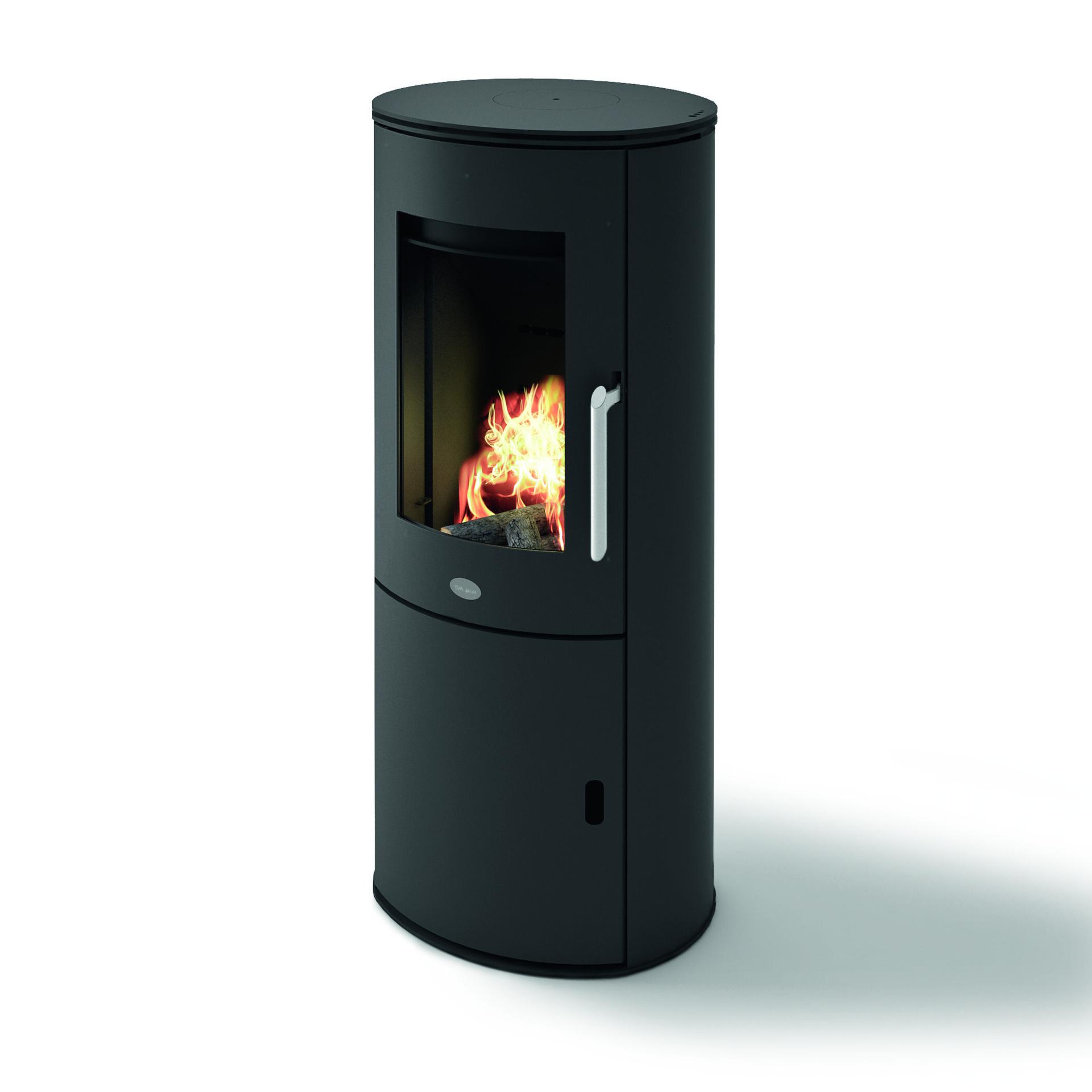 Rounded wood-burning stove with curved door, 6 mm thick top and steel covering. Vermiculite combustion chamber and air supply control. Removable ash drawer for ash collection in a separate compartment. Top and rear flue connections.
