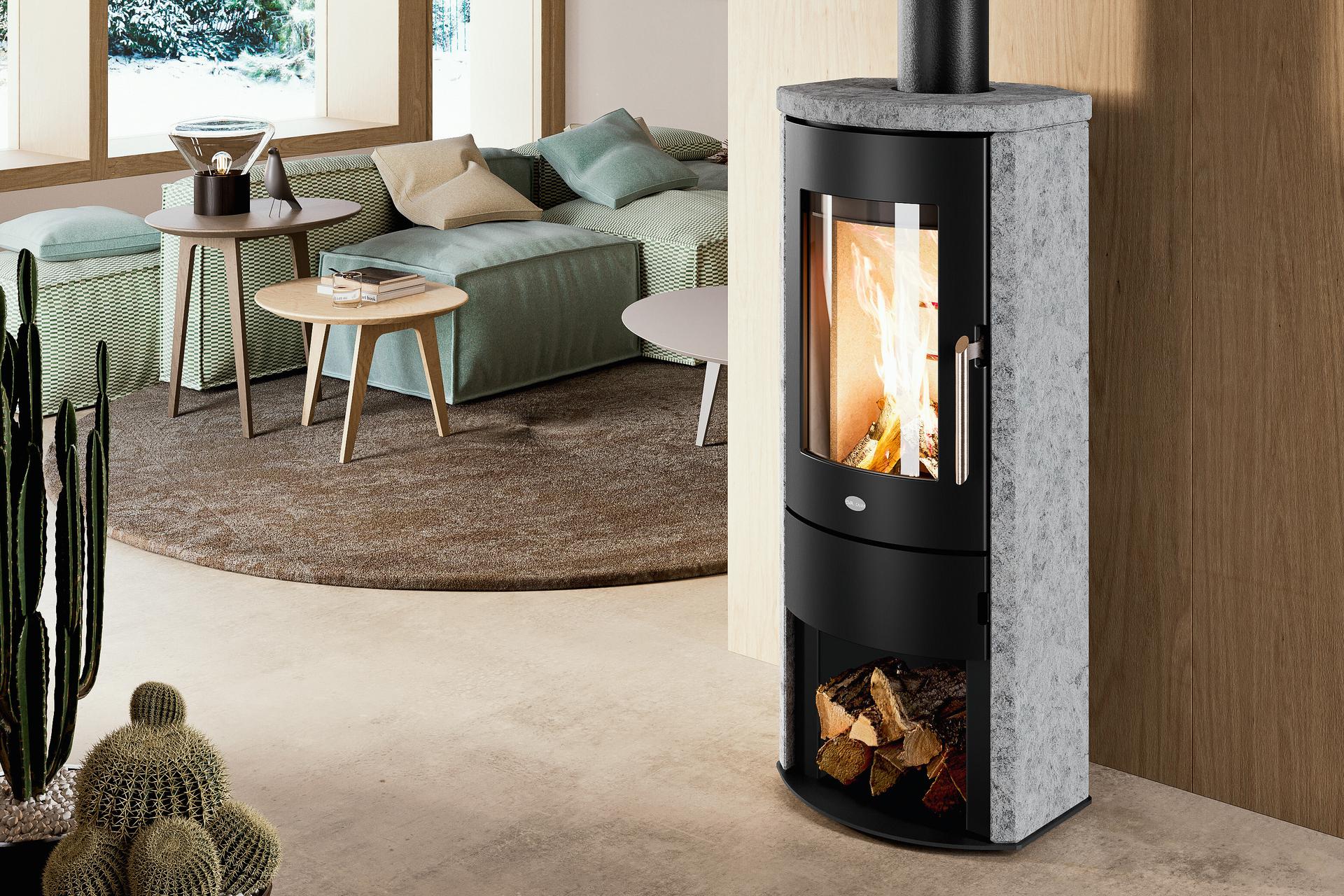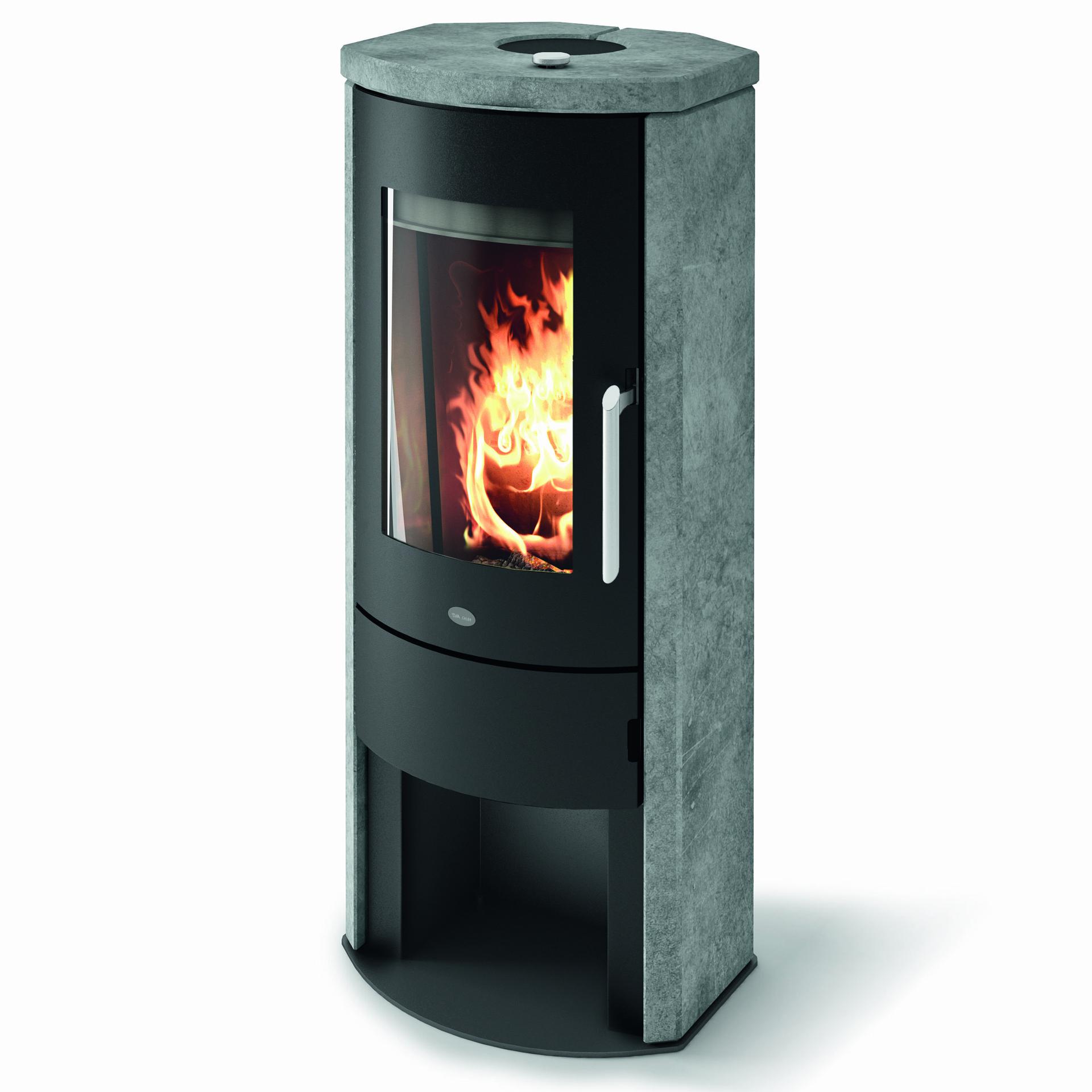 Rounded, sealed wood-burning stove with natural stone facing and firewood drawer. Vermiculite combustion chamber and combustion air regulator. Removable ash drawer for ash collection in a separate compartment. Top and rear flue connections.