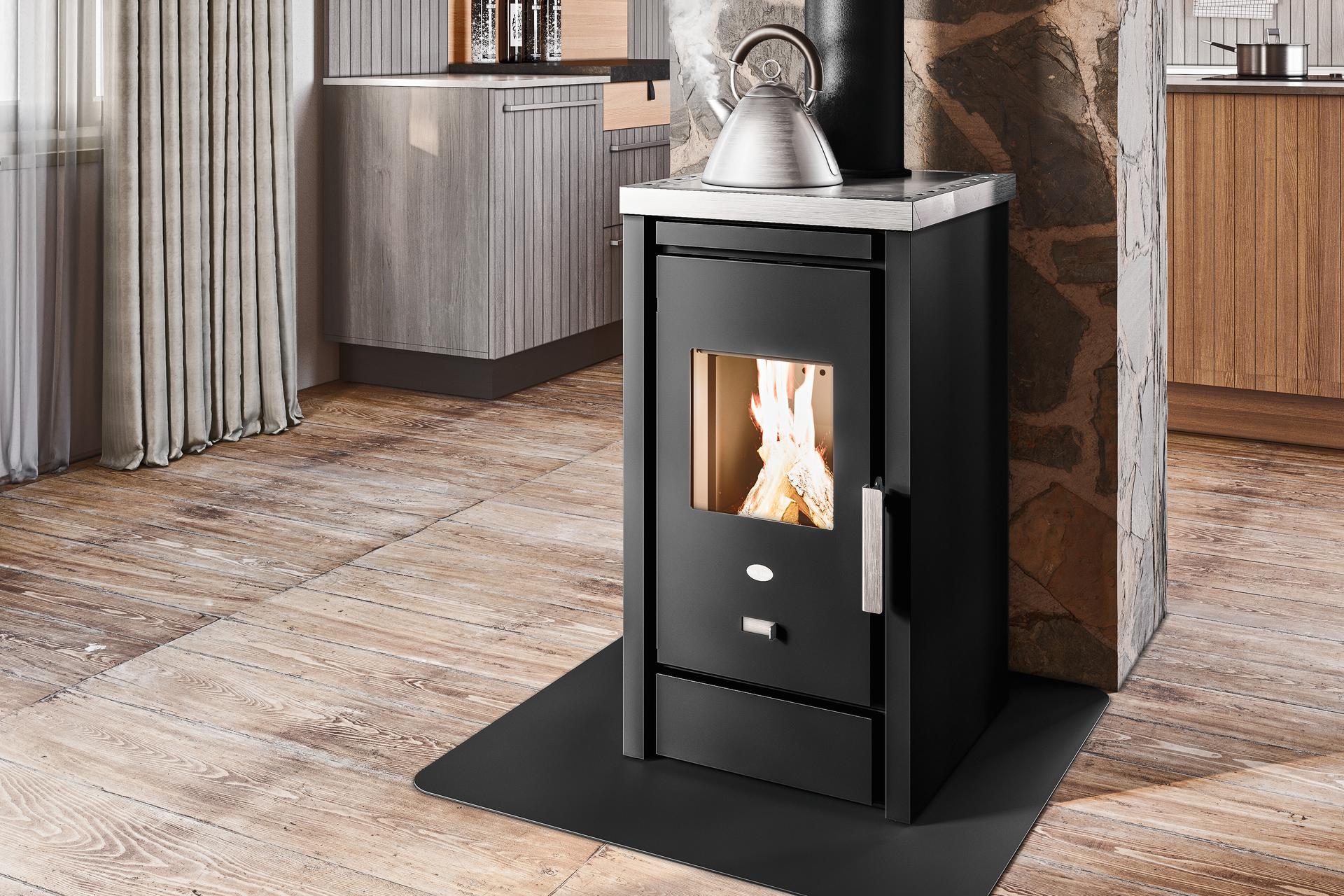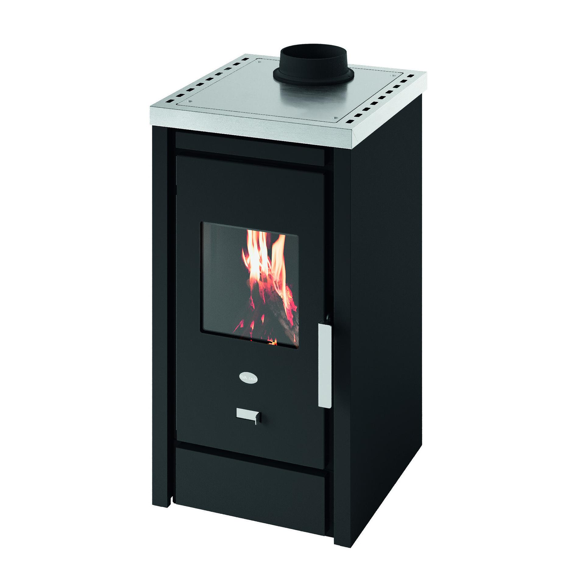 Compact stove with a steel plate to warm the food. Vermiculite combustion chamber and air supply regulator. Removable ash drawer for ash collection in a separate compartment. Top flue connection.