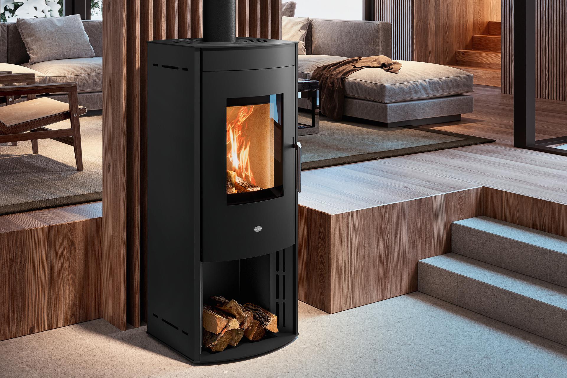 Wood-burning stove with curved door and 6 mm thick top. Vermiculite combustion chamber and air supply control. Removable ash drawer for ash collection in a separate compartment. Top and rear flue connections.