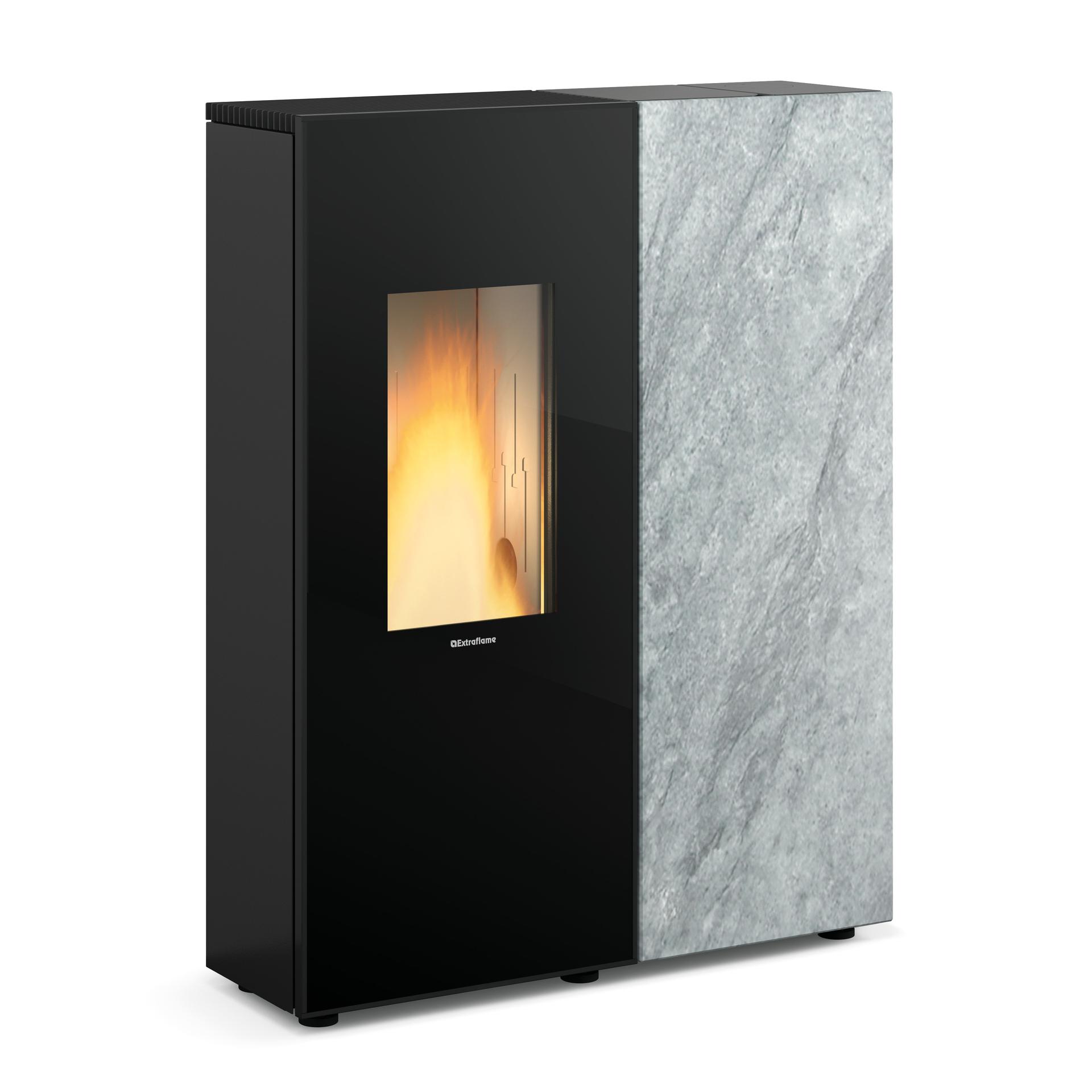 Tight pellet stove with modern linear design and double door, where the outer one is equipped with ceramic glass. The use of natural stone for the front makes this product a precious element of your space, adding elegance. The possibility of connecting the flue at the back or at the top facilitates the installation of the stove.