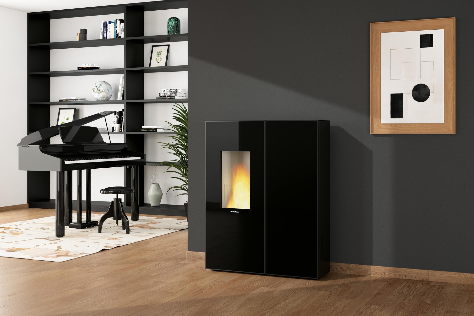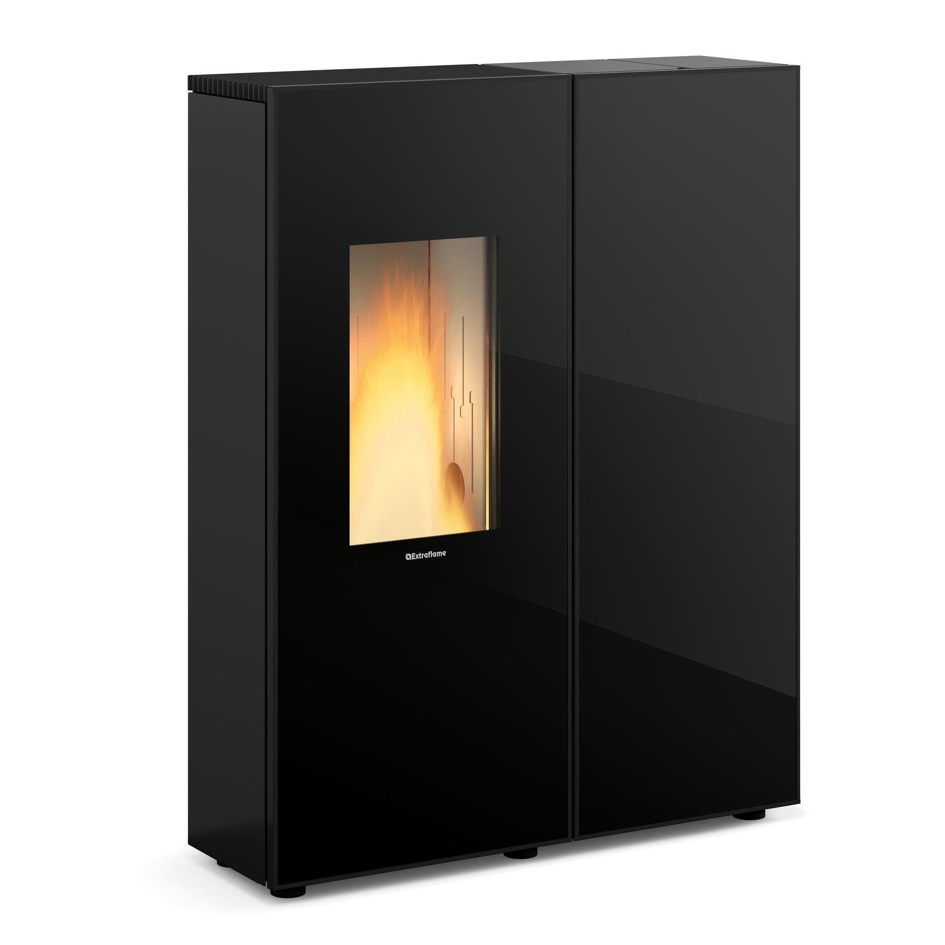 Tight pellet stove with modern linear design and double door, where the outer one is equipped with ceramic glass. The use of glass for the front makes this product a valuable element of your space. The possibility of connecting the flue at the back or at the top facilitates the installation of the stove.