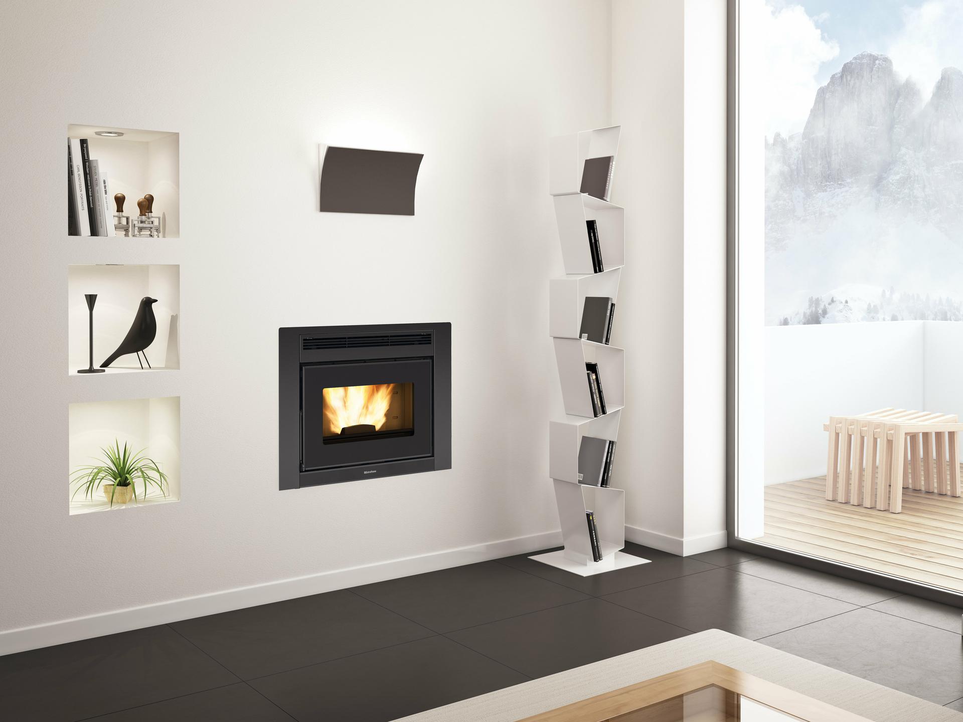 Pellet thermo-fireplace ventilated with wide fire vision. Combustion chamber in thick steel, fire door and brazier in cast iron. Shell and tube exchanger with automatic cleaning. Front room ventilation with dedicated motor, with Comfort function, excludable. Ceramic igniter. Lifting handles to facilitate assemly.