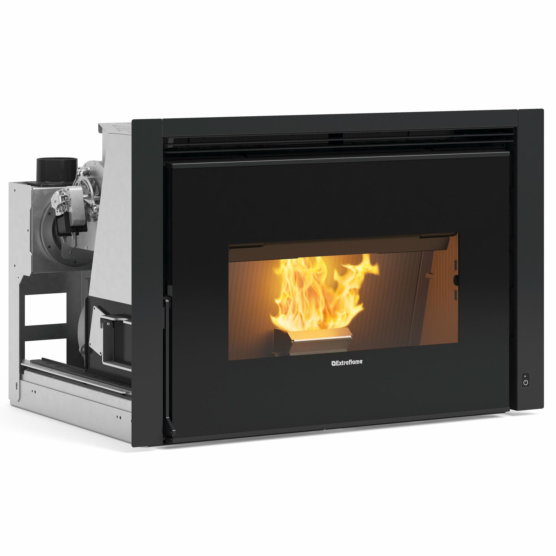 Pellet insert ductable with wide fire vision. Double ducting system with two dedicated motors till 8m, thermostable. Minimum pellet tank level probe.