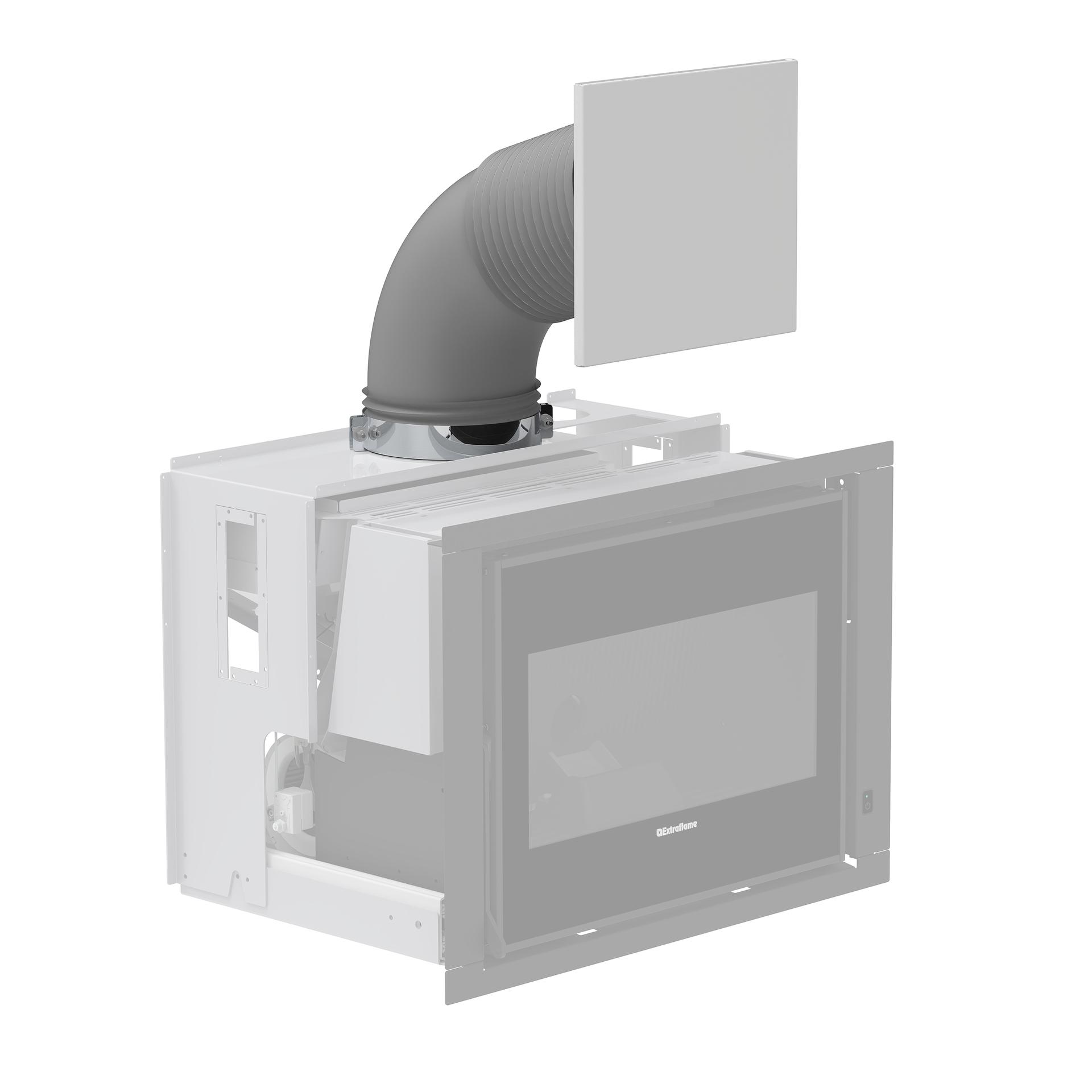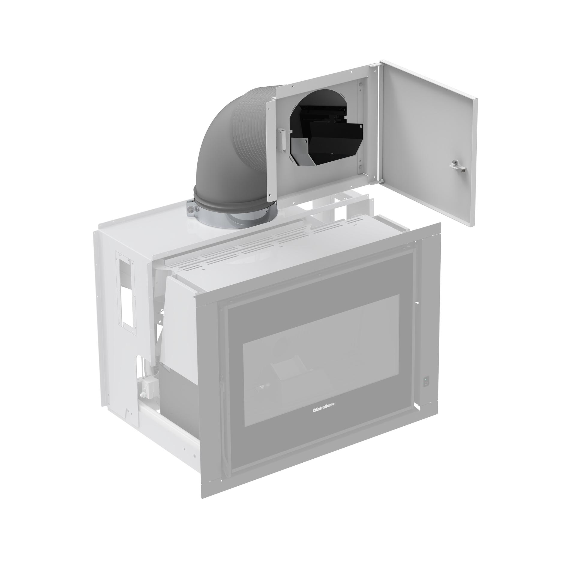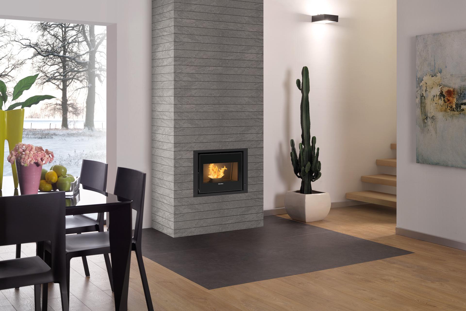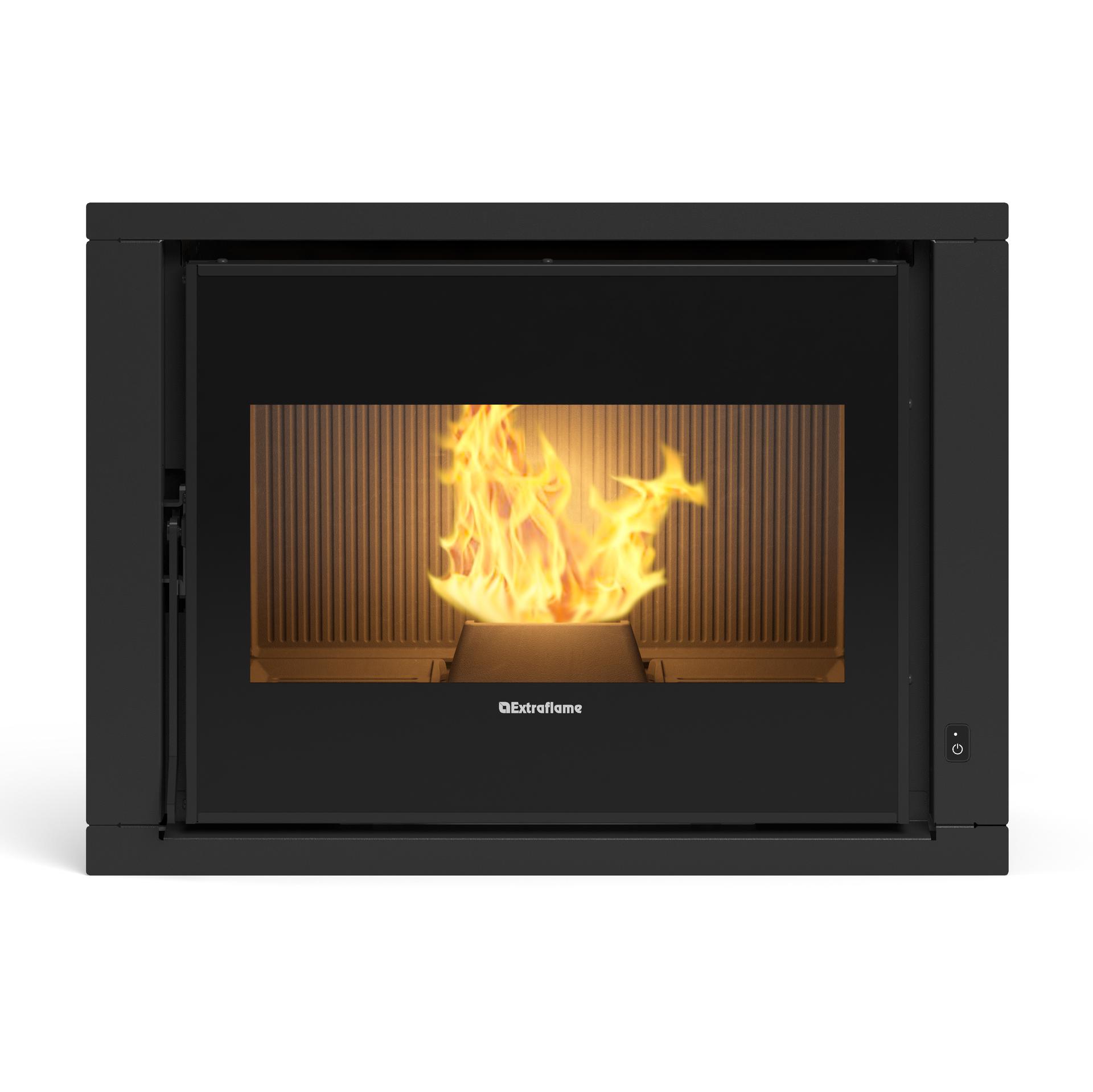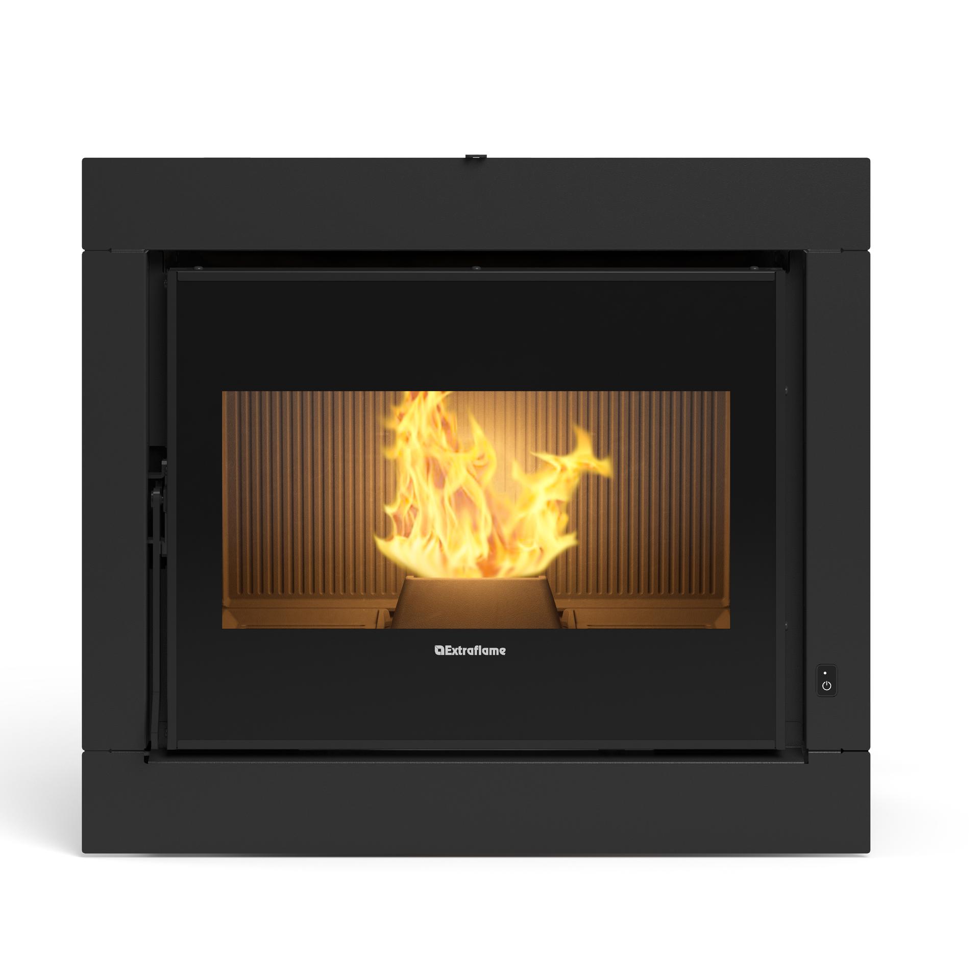 Ventilated pellet insert with cast iron fire door, hearth and brazier. Front room ventilation controlled by Pro Air Setup with quiet, regular and boost modes. The level sensor informs the user when the pellet tank needs refilling.
