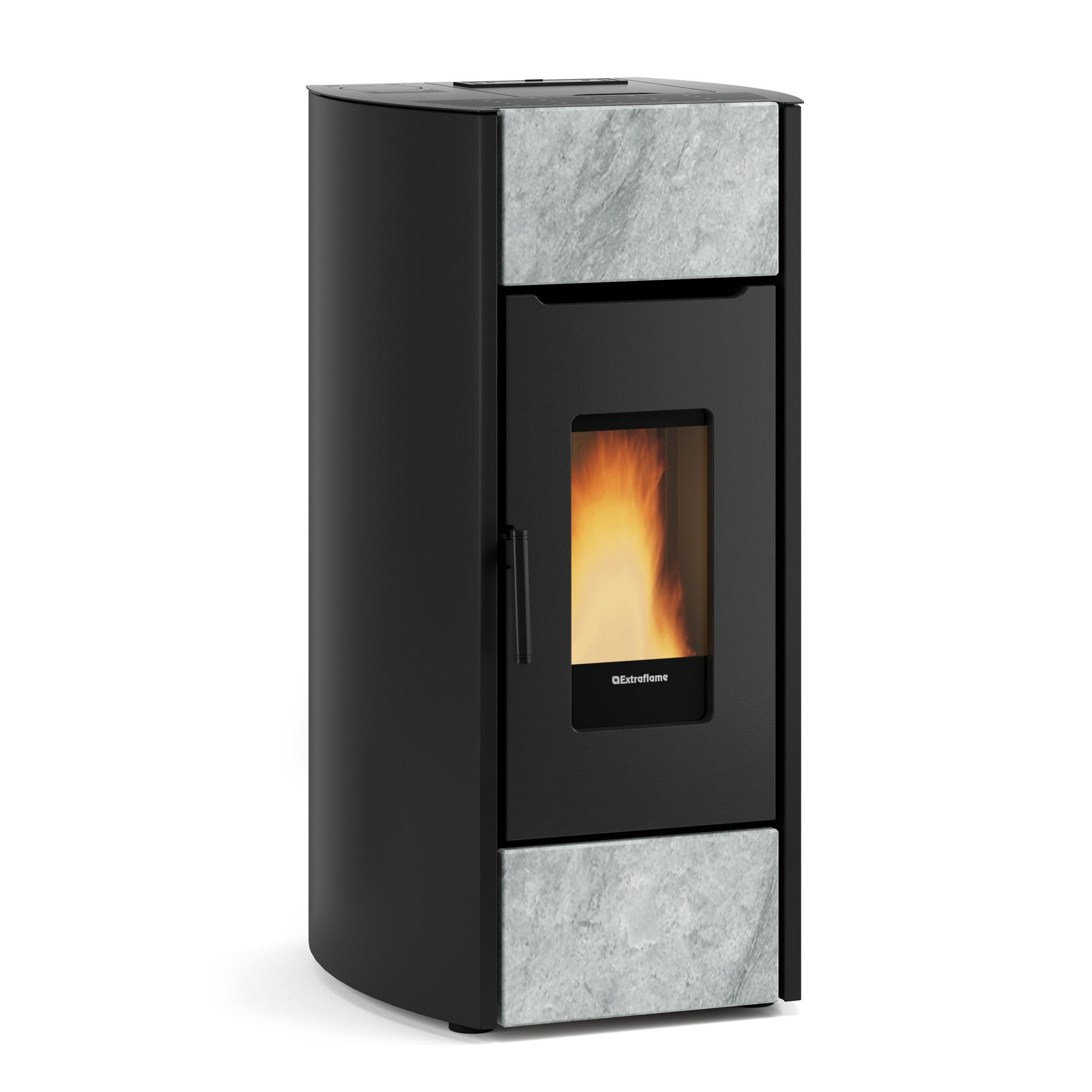 The La Nordica Extraflame Mirka is the stove with the rounded edges and the linear design that integrates front elements in natural stone for a distinctive design. Considering also the smoke outlet options that can be rear or top, make this pellet stove easy to place in the room.