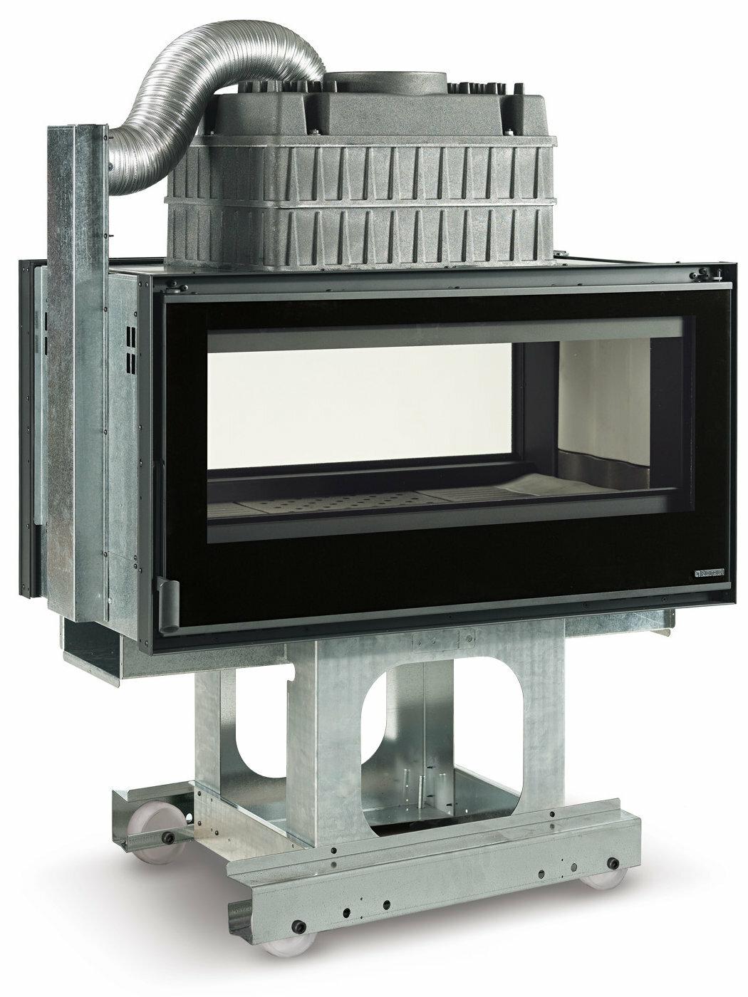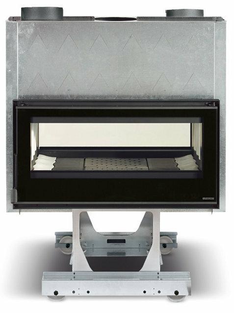 Wood burning double side hearth for fireplaces. Cast iron structure. Internal facing of the hearth in cast iron and Nordiker. Adjustable primary and secondary air for a better combustion control. Post combustion system for low emissions. Ceramic glass.