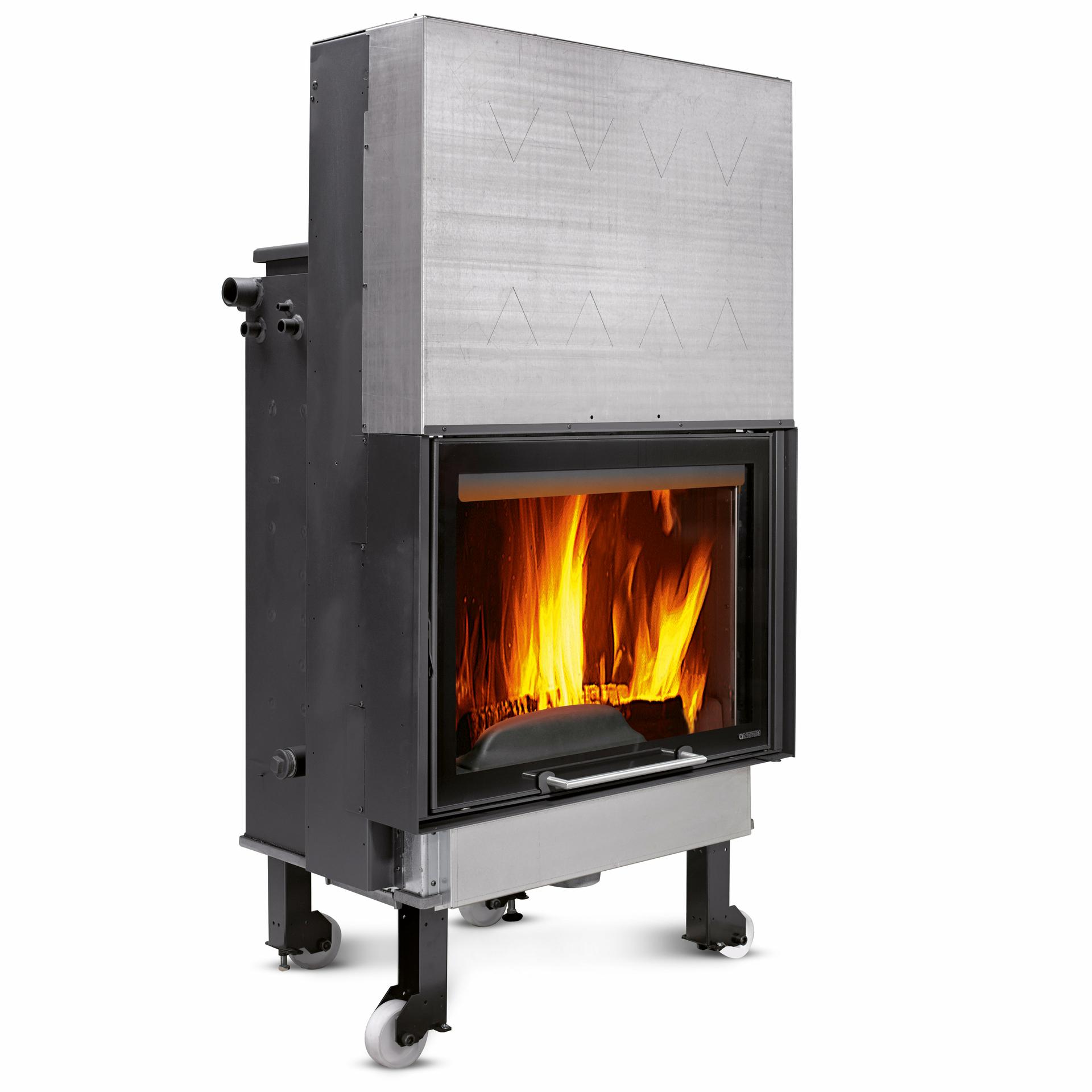 Wood burning thermo-chimney with DSA security device (DSA valve not included). Internal facing of the hearth in cast iron and Nordiker. Disappearing glass.