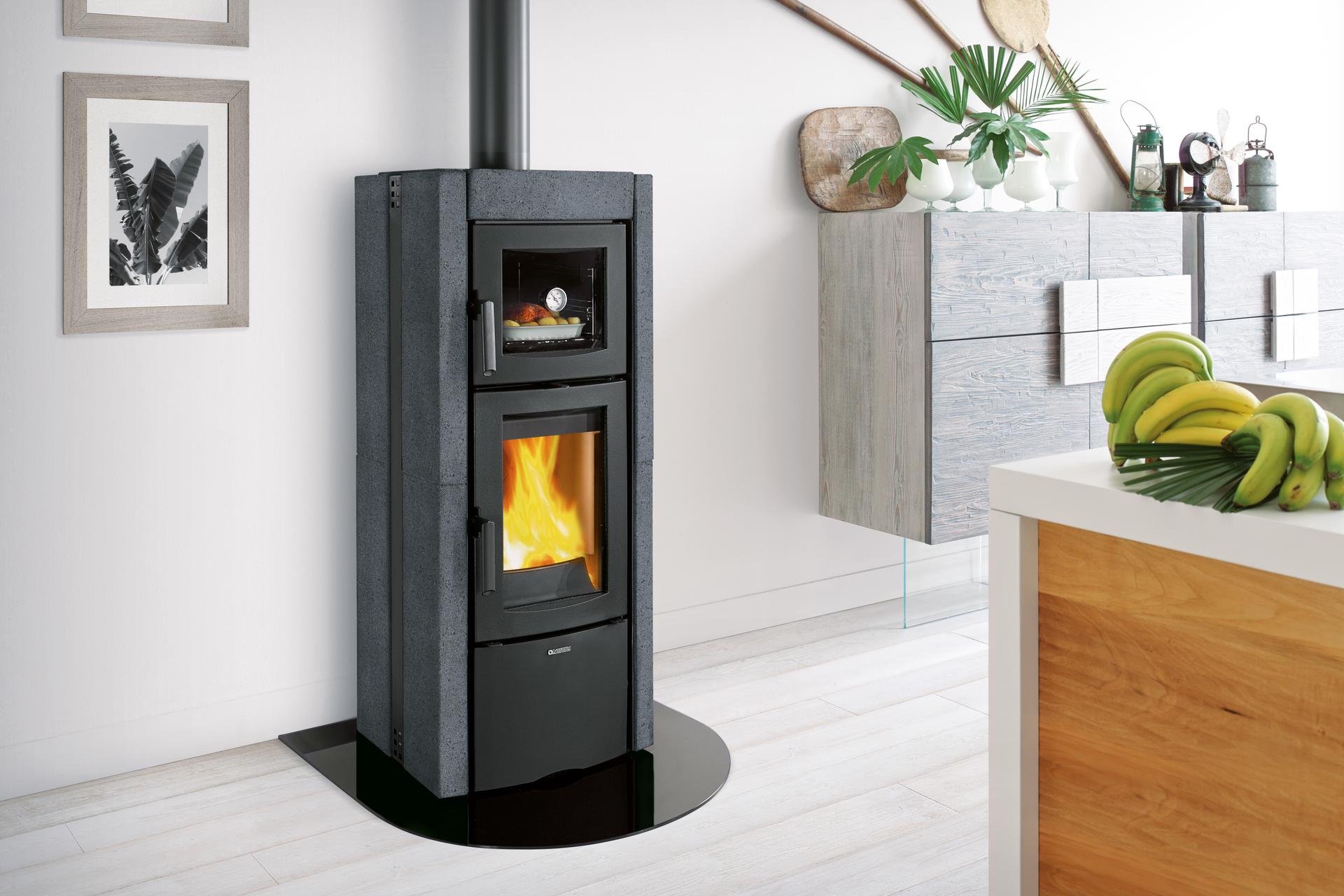 Wood burning stove with external facing in vulcan stone and porcelain enamelled steel oven. Enameled cast iron doors, top, base and frame. Internal facing of the hearth in cast iron. Ceramic glass with a wide fire vision.