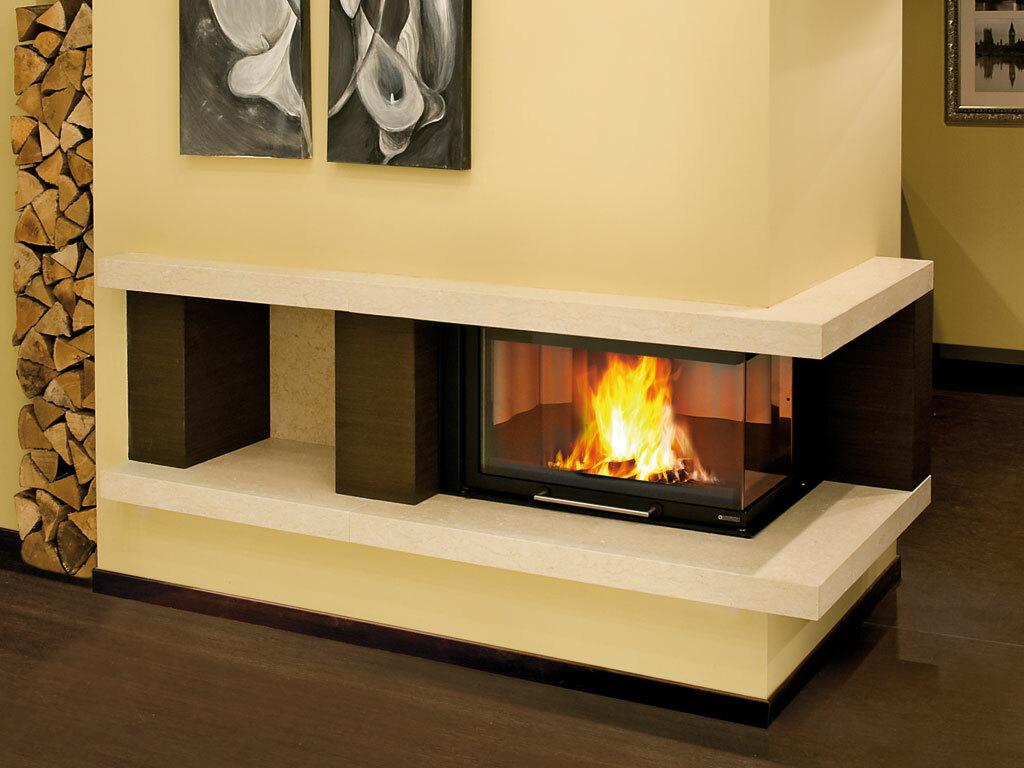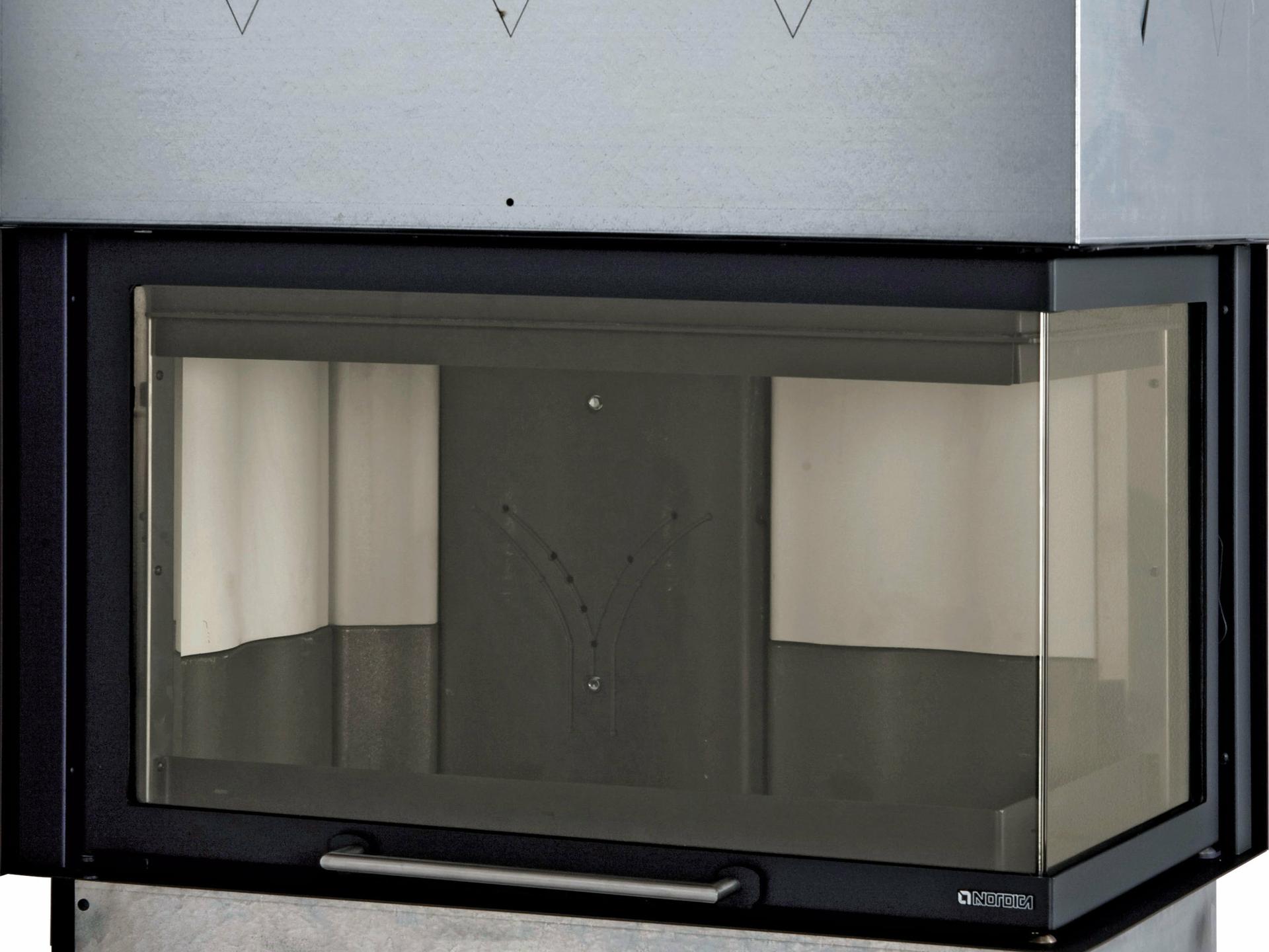 Corner monoblocco for fireplaces with angled ceramic glass in a single piece. Vanishing and sliding door on silent telescopic slides. Internal facing of the hearth in cast iron and Nordiker. Structure, fire plan and grid in cast iron. 3 mm thick special steel cape.