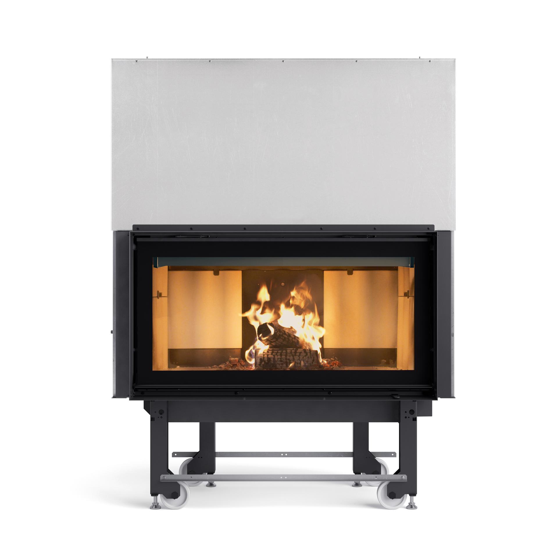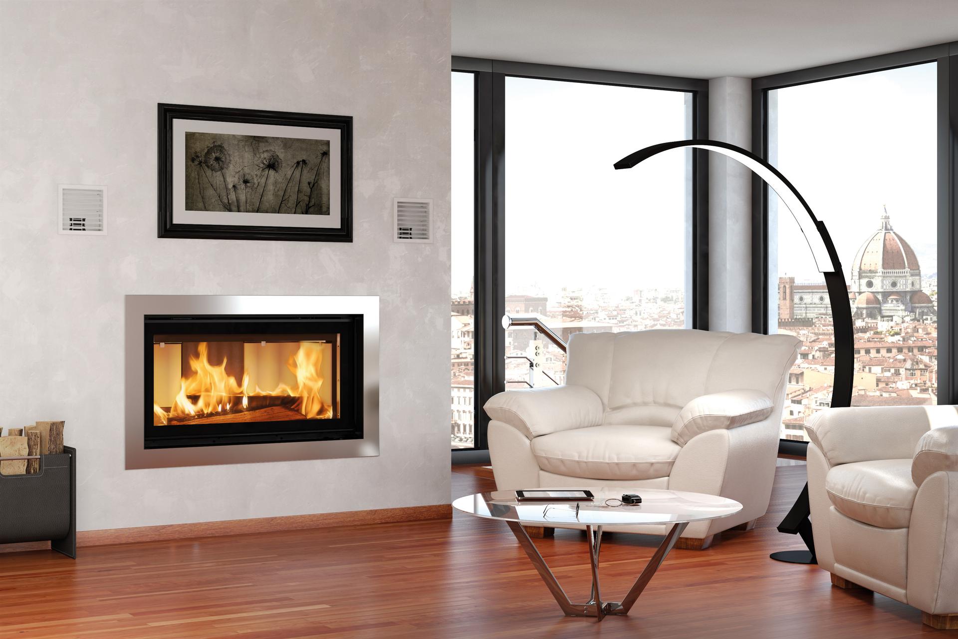 Monoblocco for fireplaces with door opening at 45° for internal ceramic glass cleaning. The facade is in stainless steel. The internal facing of the fireplace is in cast iron and Nordiker.
