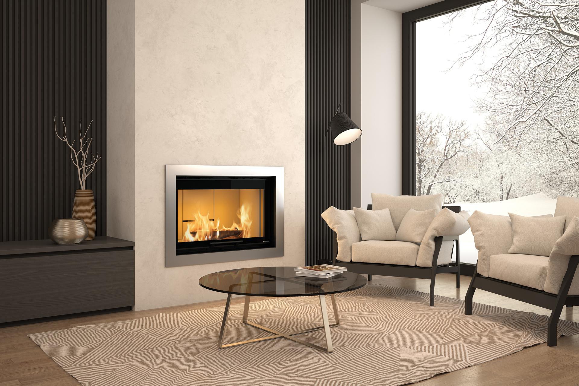 Wood burning monoblock for fireplaces with PRS system for better heating performance. Made with thick construction materials. Stand with wheels and adjustable height for easy positioning. Combustion chamber with tippable cast iron grate with extractable ash drawer is inspectable and covered by the replaceable Nordiker.