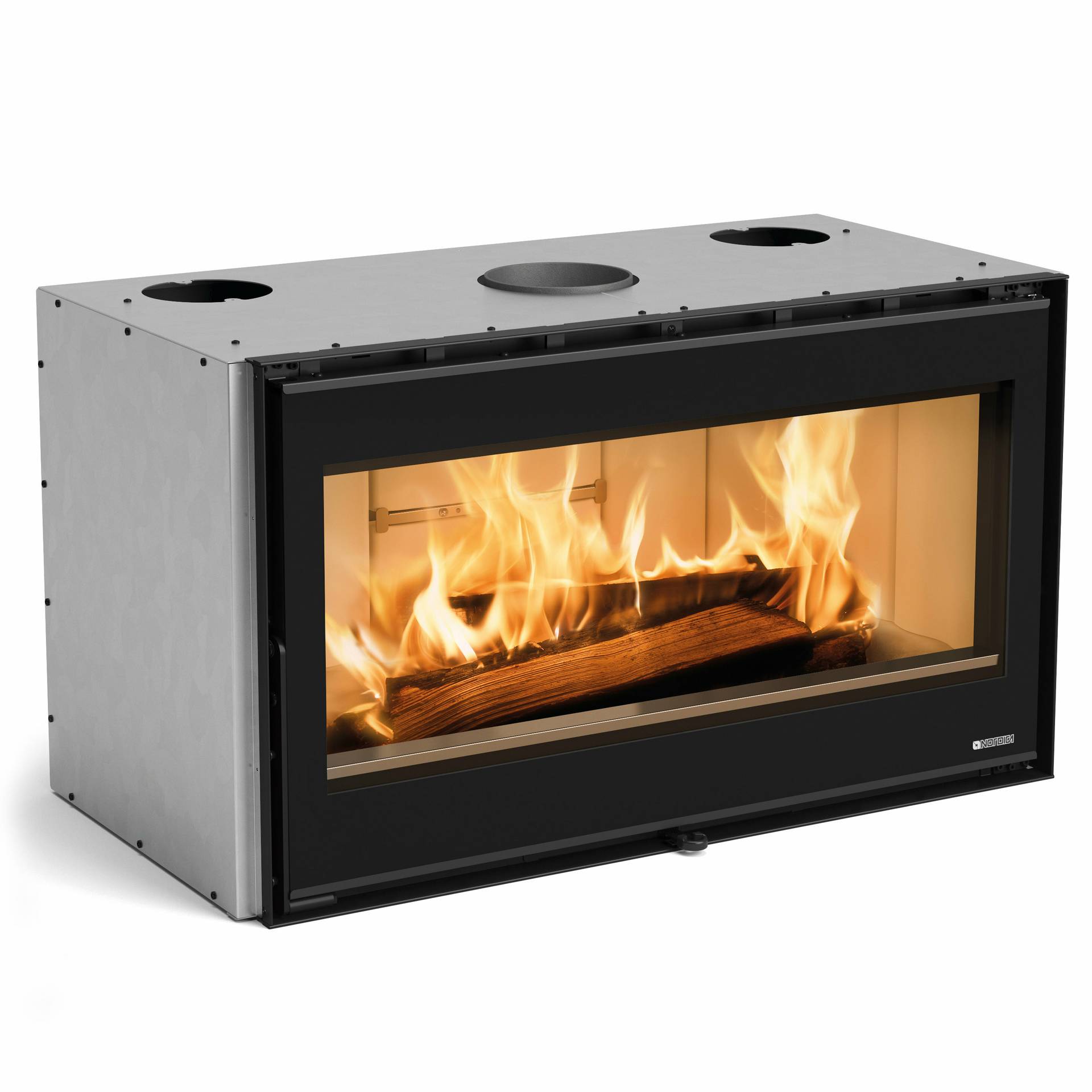 Wood burning insert with panoramic view. Low-floor plain for great flame vision. Internal facing of the hearth in Nordiker. Fire door and grille in cast iron. Reversible door with ceramic glass. Adjustable primary and secondary air for a better combustion control with post combustion system for low emissions. External air intake.