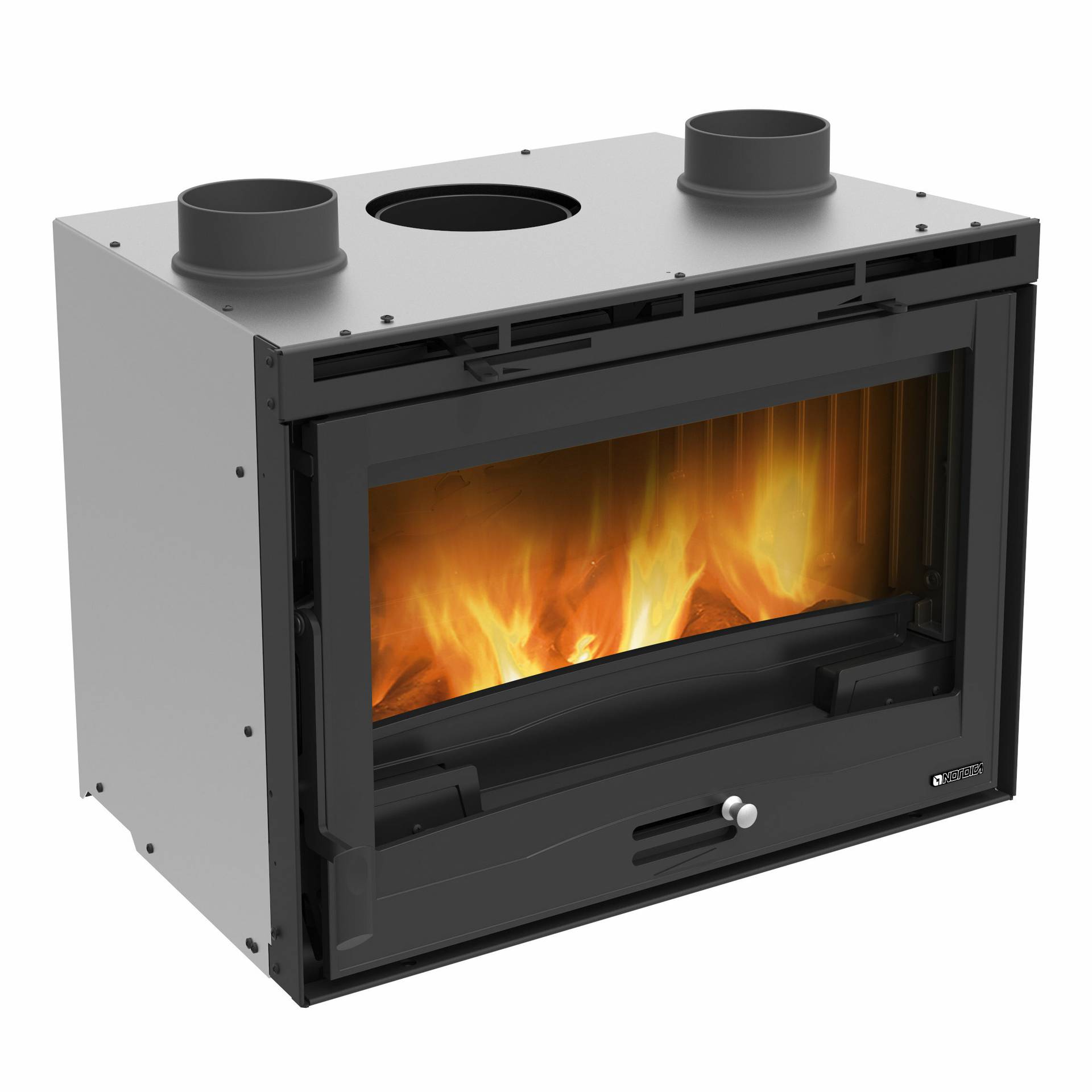 Wood burning ventilated insert with minimal height. Two tangential fan for front room ventilation. Internal facing of the hearth in cast iron and Nordiker. Fire door and structure in cast iron. Ceramic glass. Adjustable primary and secondary air for a better combustion control with post combustion system for low emissions.