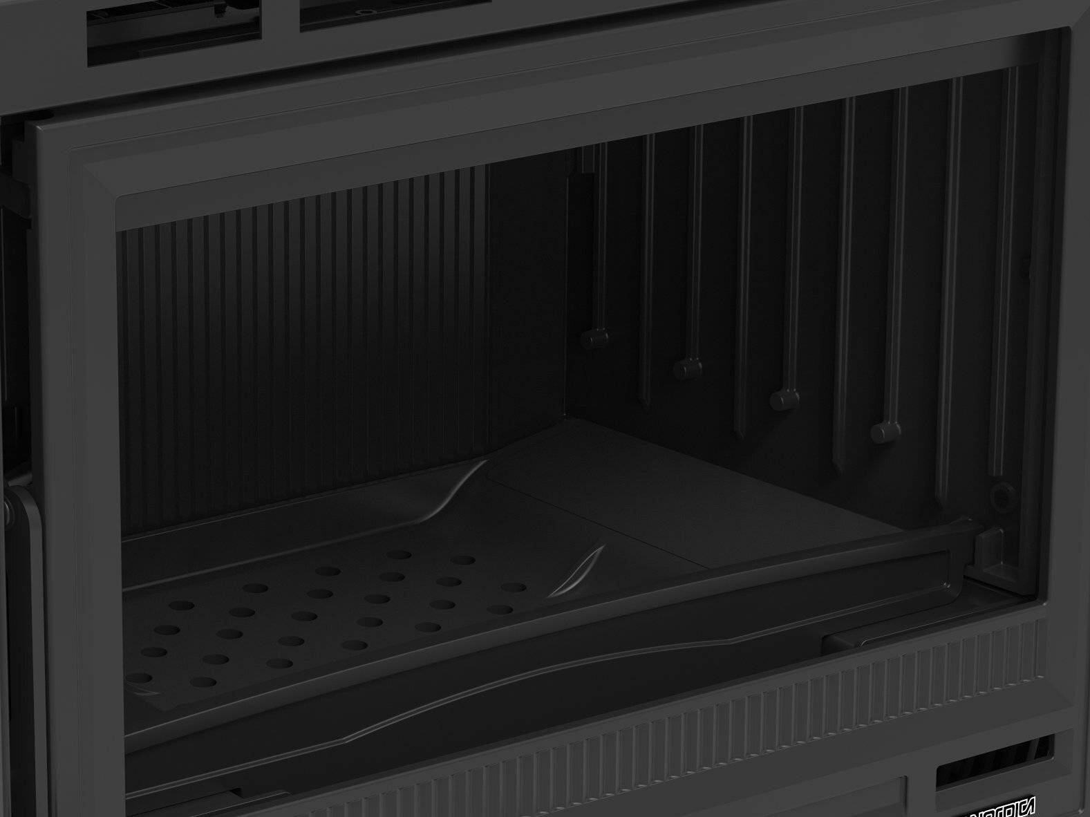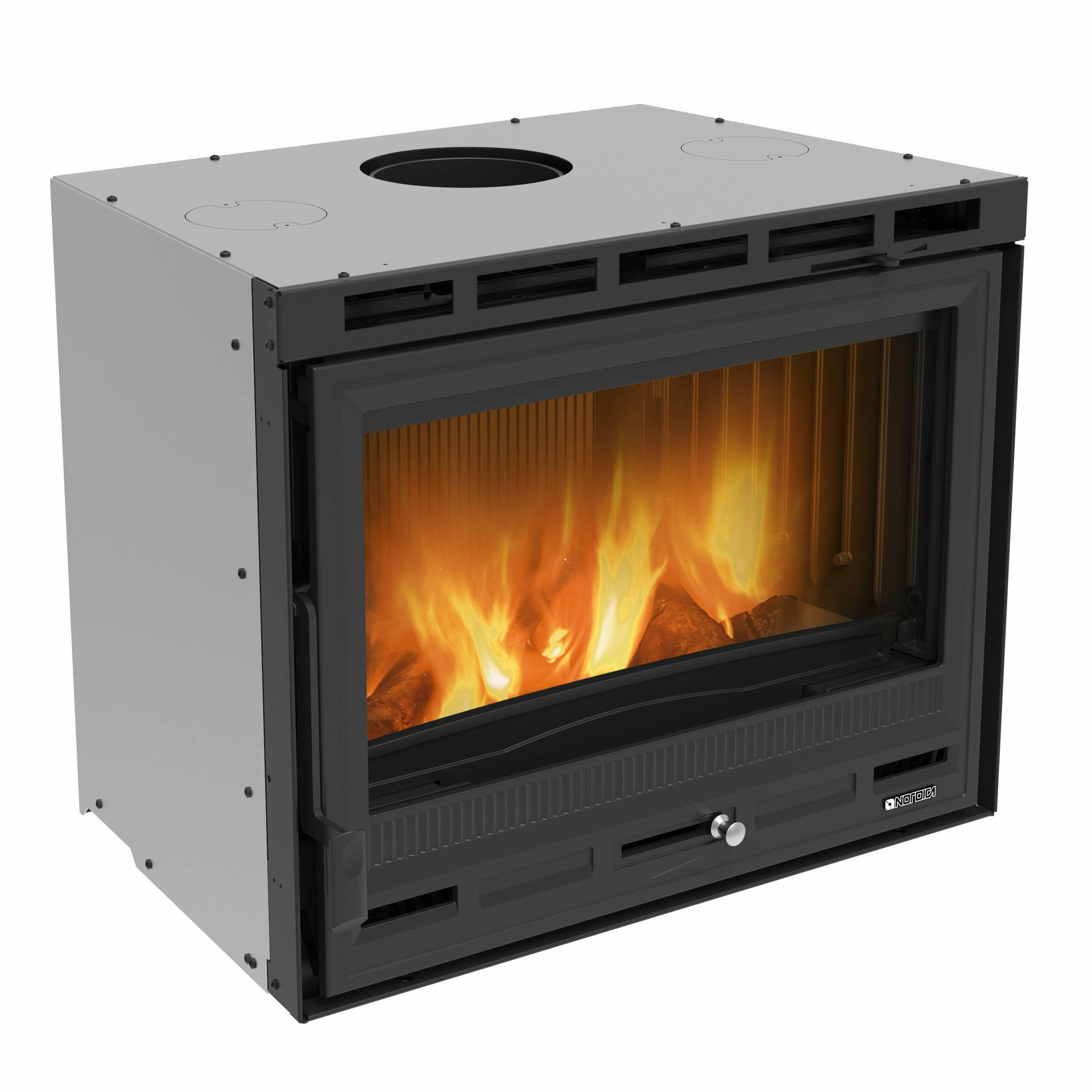 Wood burning ventilated insert with two tangential fan for front room ventilation. Internal facing of the hearth in cast iron. Fire door and structure in cast iron. Ceramic glass. Adjustable primary and secondary air for a better combustion control with post combustion system for low emissions.
