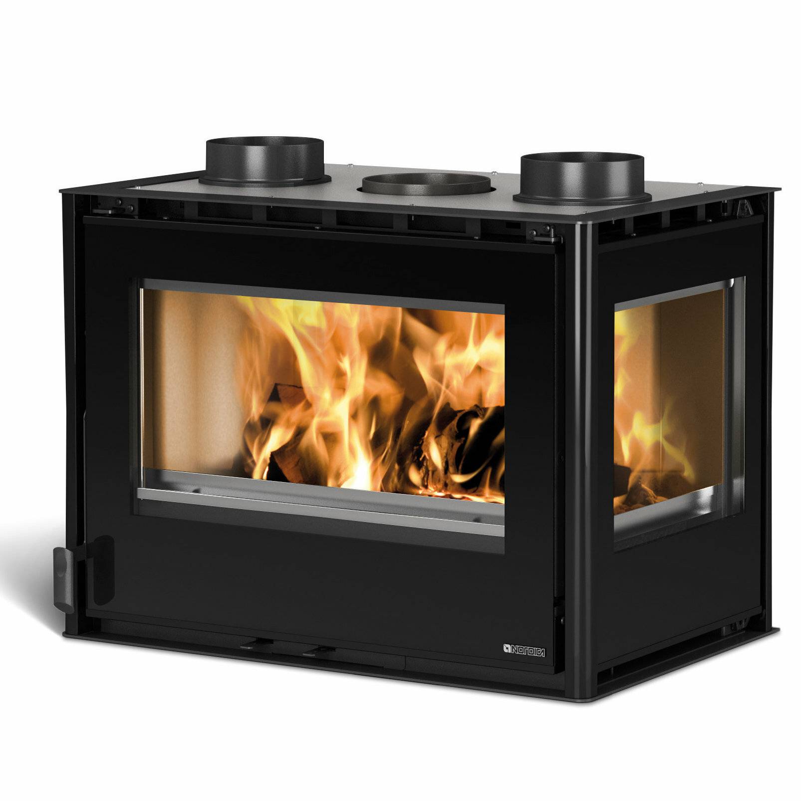 Wood burning insert for fireplaces with a two sides panoramic view of the fire. Internal facing of the hearth in cast iron and Nordiker. Reversible fire door and structure in cast iron. Ceramic glass. Adjustable primary and secondary air for a better combustion control with post combustion system for low emissions.