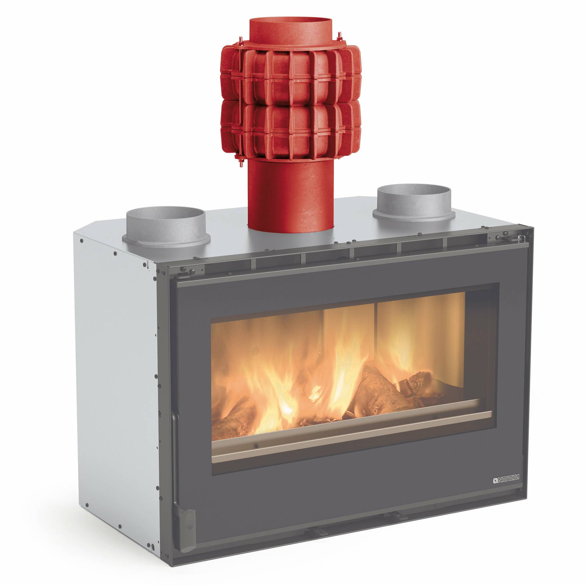 Wood burning insert with panoramic view of the fire and Power Radiant System (PRS). Low-floor plain for great flame vision. Internal facing of the hearth in cast iron and Nordiker. Fire door and grille in cast iron. Reversible door with ceramic glass. Adjustable primary and secondary air for a better combustion control with post combustion system for low emissions. External air intake.