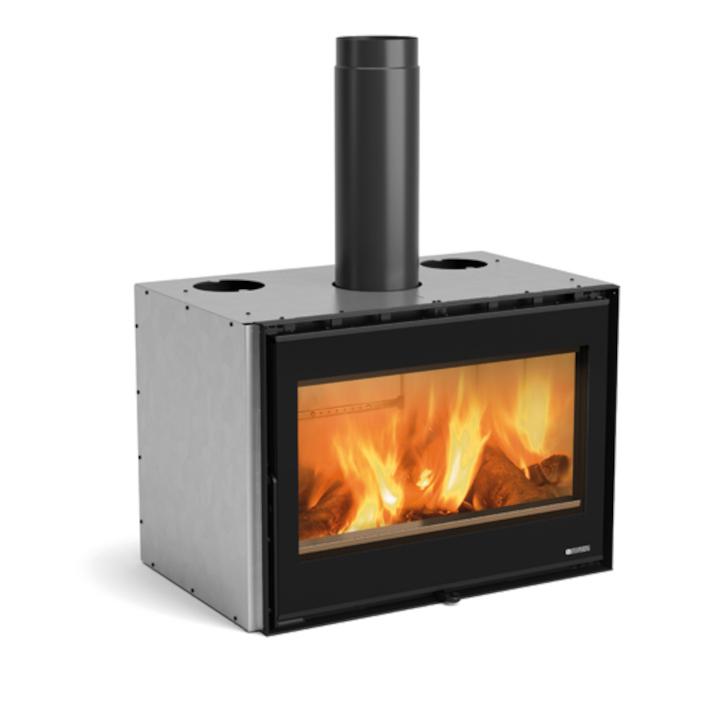 Wood burning insert with Power Radian System and panoramic view. Low-floor plain for great flame vision. Internal facing of the hearth in cast iron and Nordiker. Fire door and grille in cast iron. Reversible door with ceramic glass. Adjustable primary and secondary air for a better combustion control with post combustion system for low emissions. External air intake.