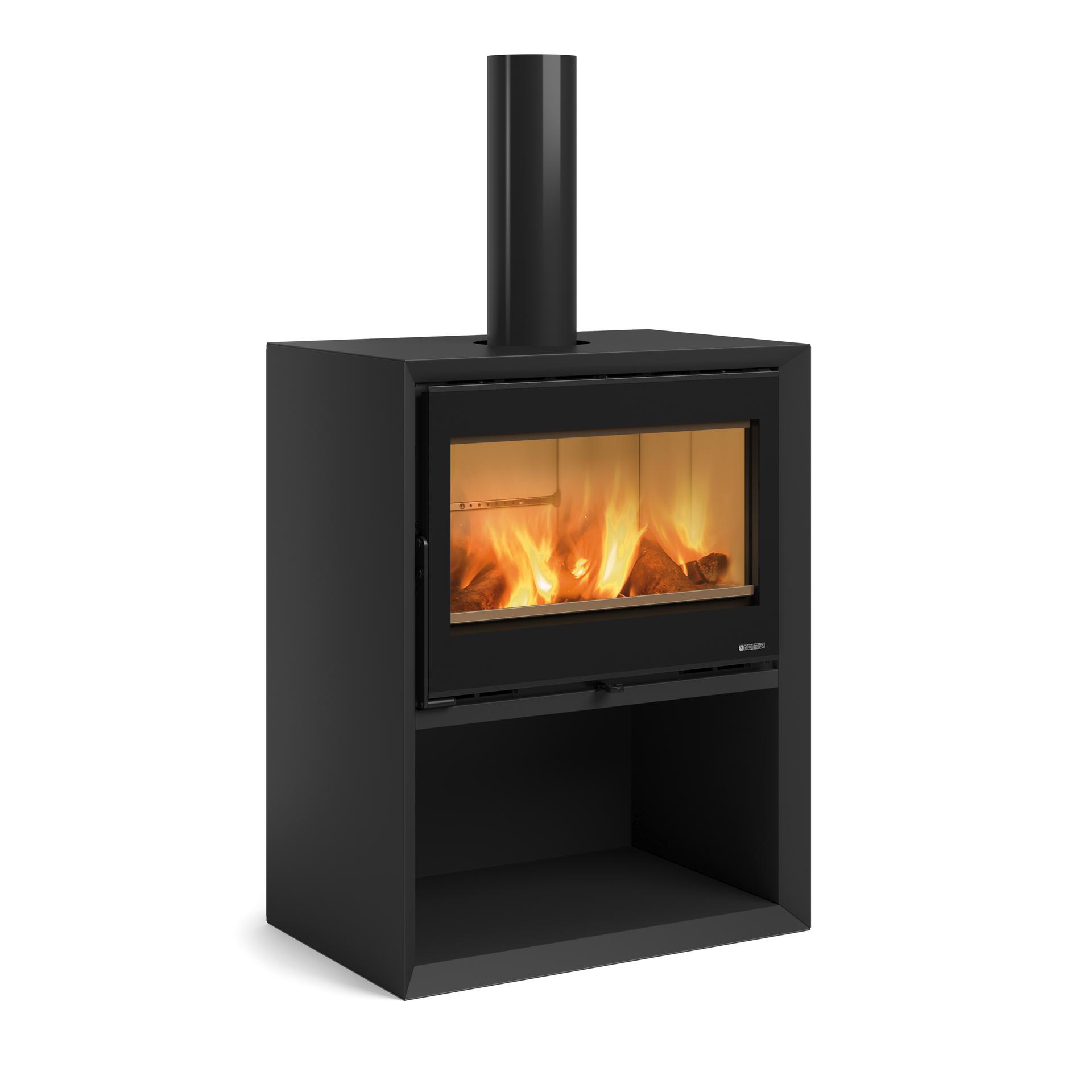 The La Nordica Dante con Portalegna wood burning stove with heat recovery is a stylish heating solution that incorporates the wood holder as a plinth. The panoramic, reversible fire door and the low fire plain ensure a great view of the flames. The door and grate are made of cast iron and the hearth is made of Nordiker.