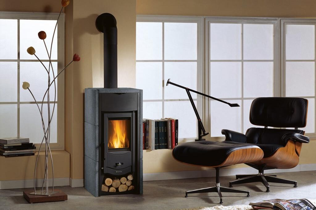 Wood-burning stove with external facing in vulcan stone. Internal facing in cast iron. Adjustable primary and secondary air for better combustion control and low emissions. Enameled cast iron fire door, ceramic glass. Log holder for a tidy wood storage.